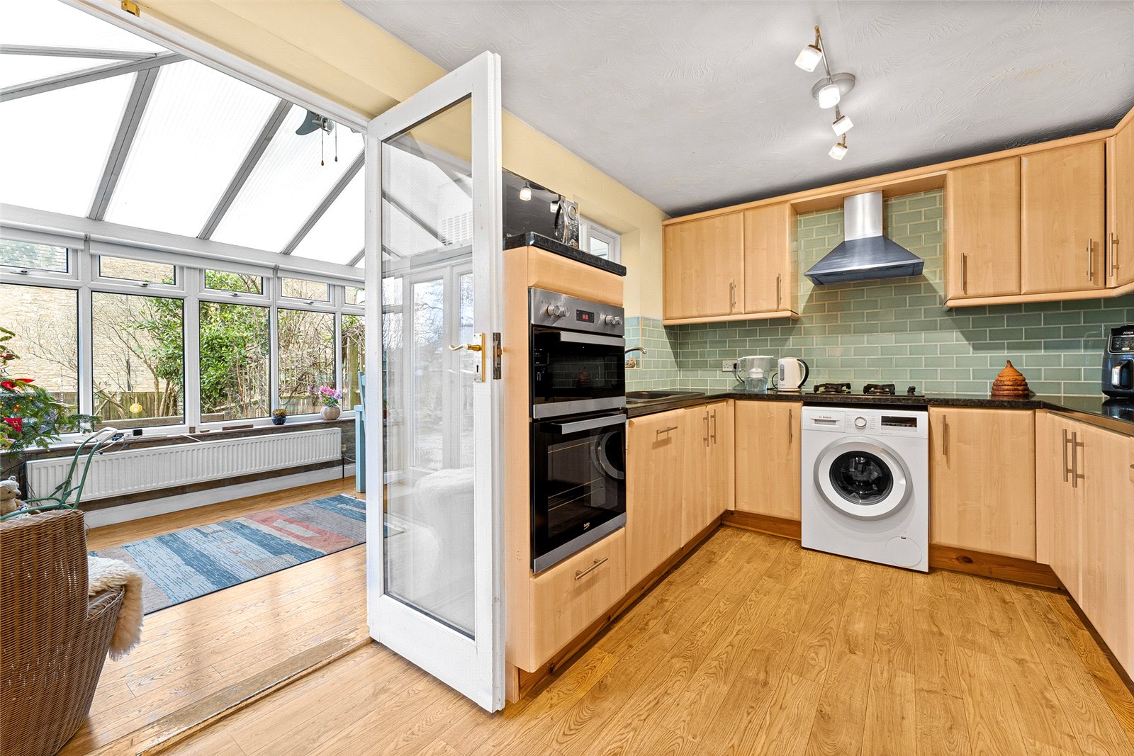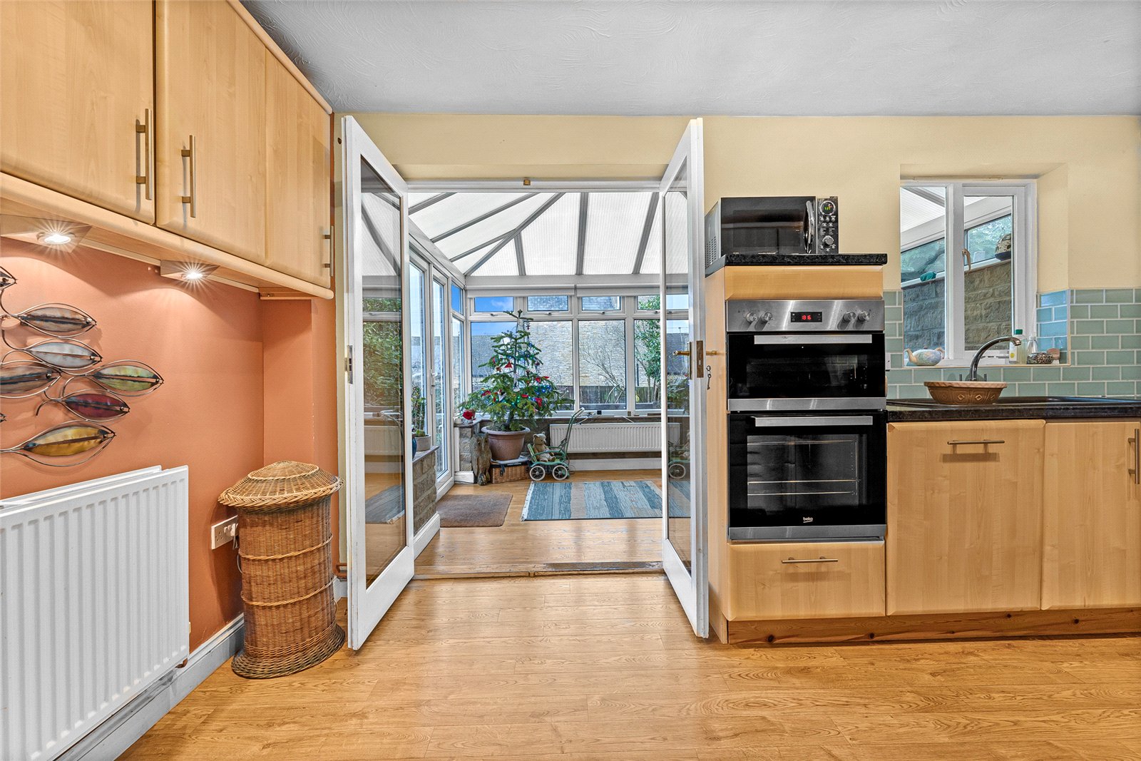 Conservatory: Double glazed windows and doors overlooking the rear garden, radiator, wooden floor.