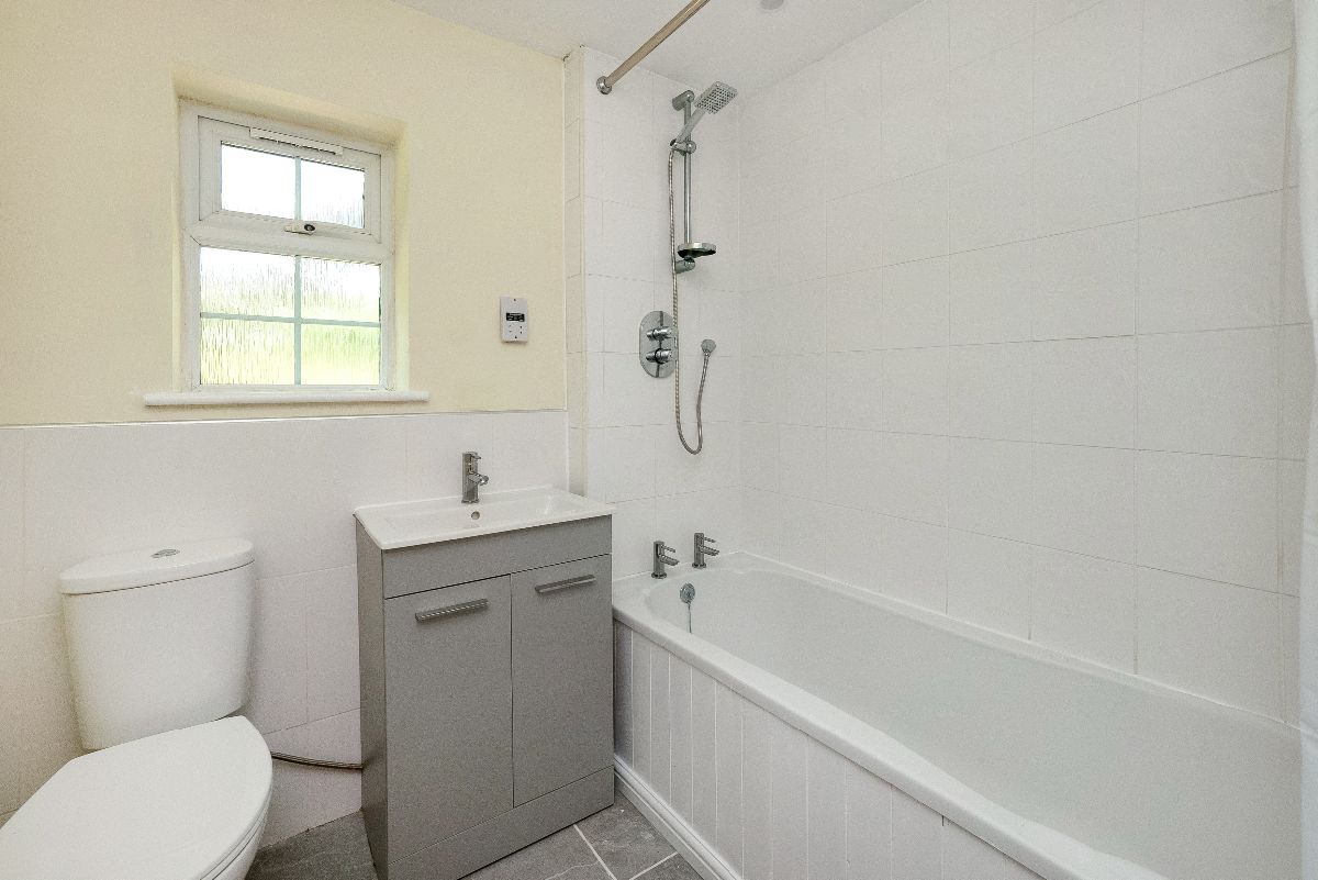 Bathroom - comprising white suite with panelled bath with shower over, hand wash basin with vanity unit below, low level w.c., part tiled walls, tiles floor, double glazed window to rear aspect