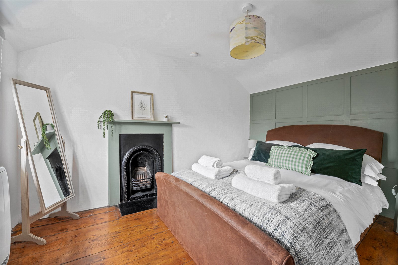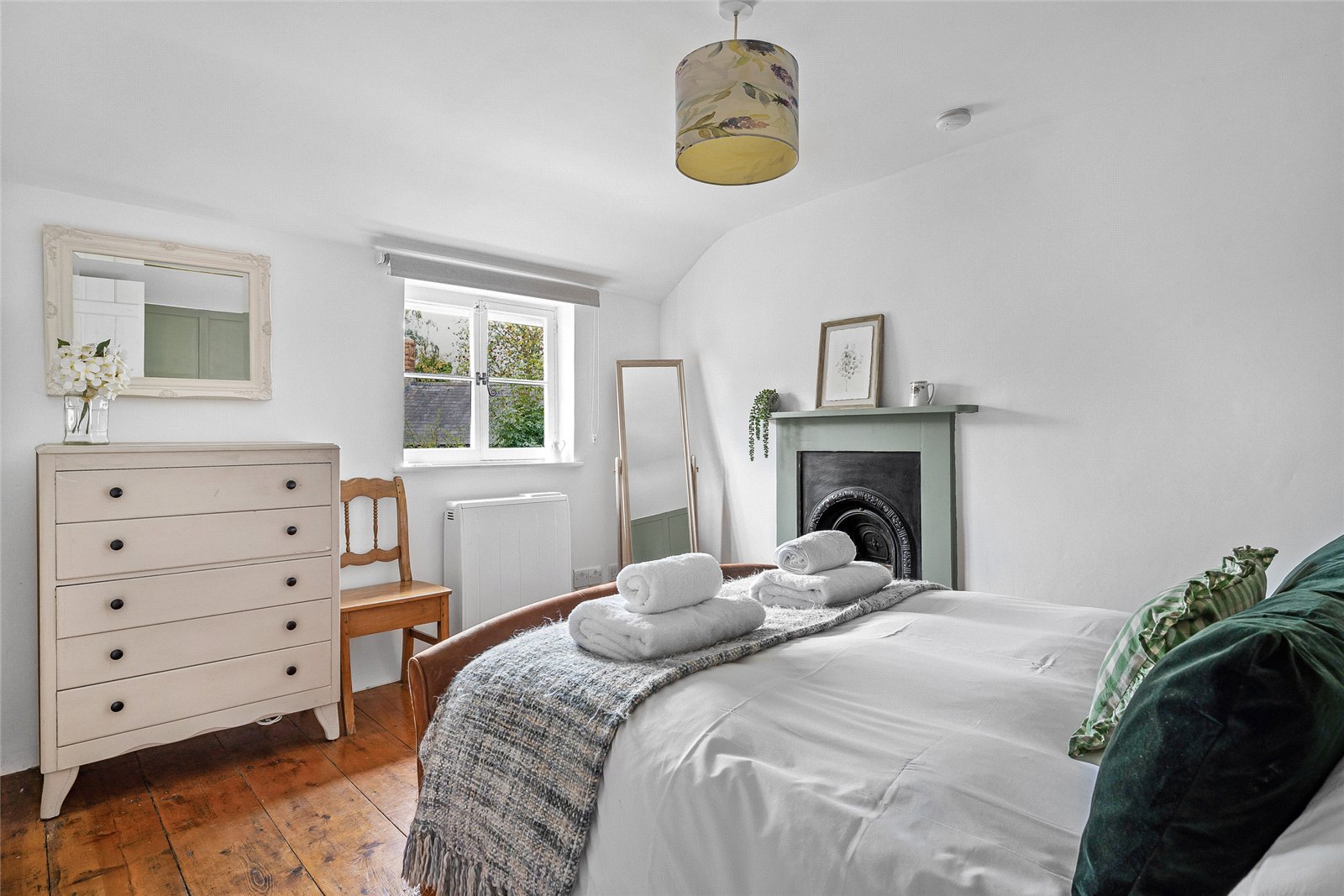 Bedroom One: Window to front aspect, original wood flooring, panelled wall and original feature fireplace.
