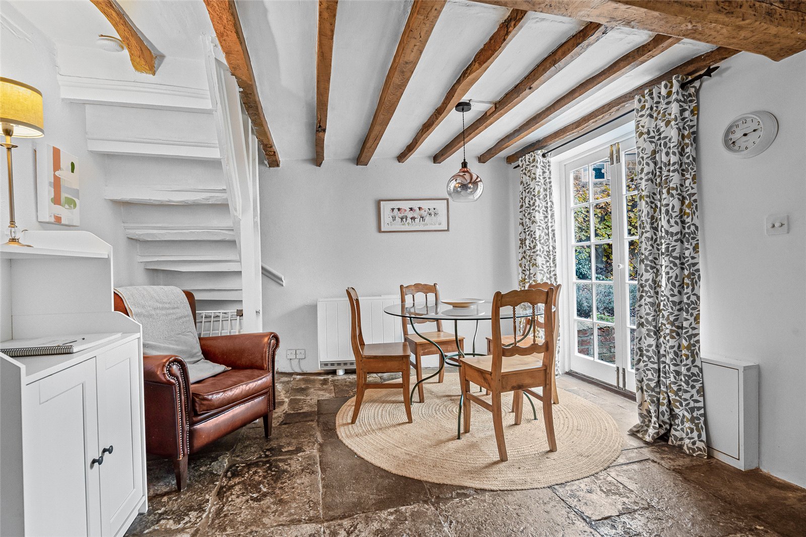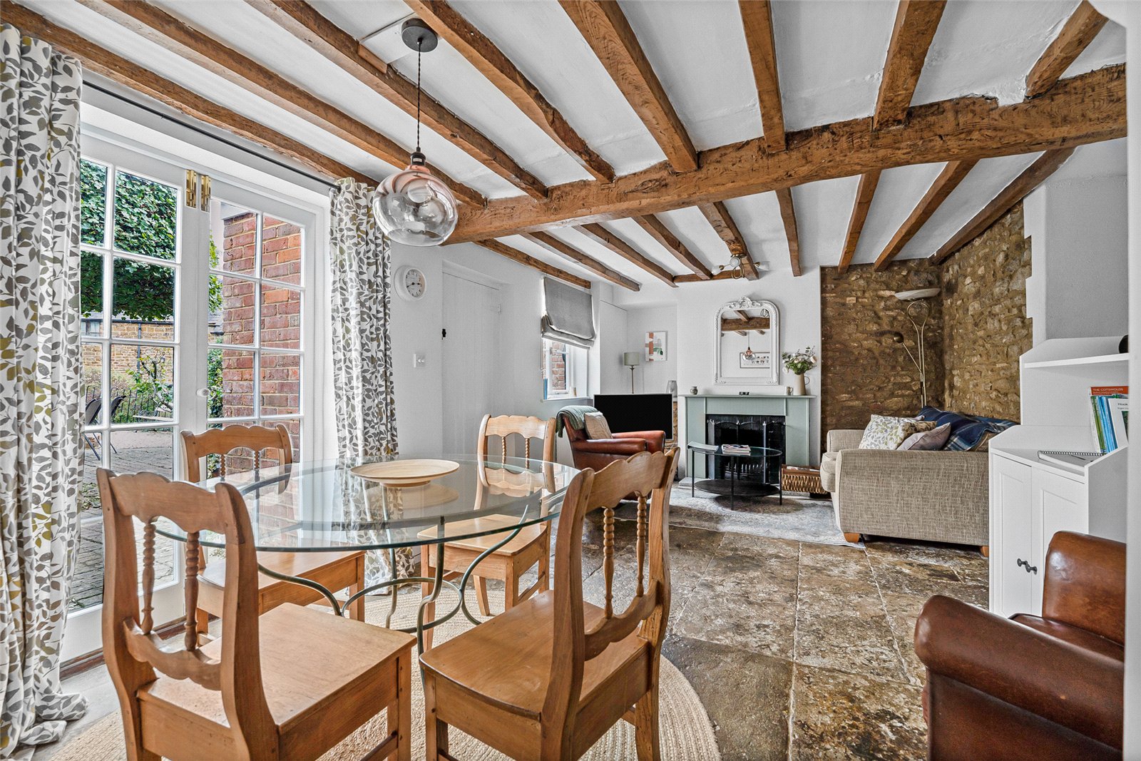 Living/Dining Room: Exposed beams, flag stone floor, feature open fireplace, window to front aspect, French doors leading out onto front courtyard garden.