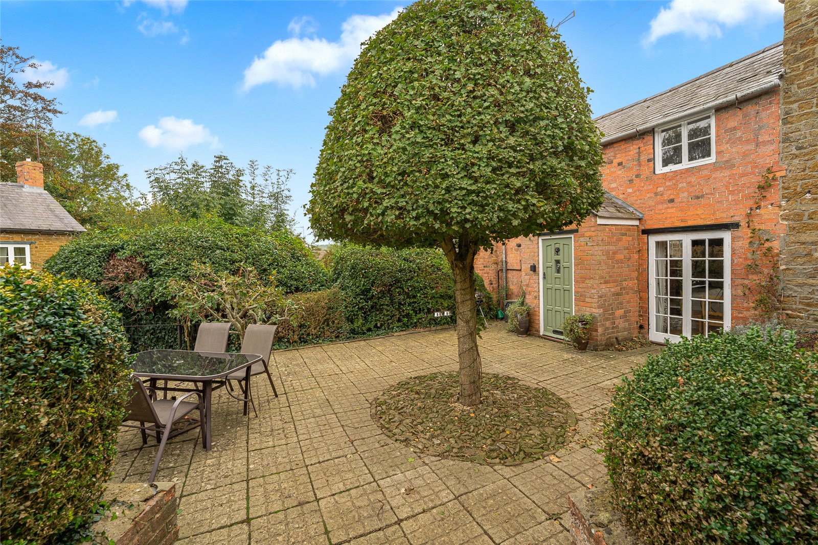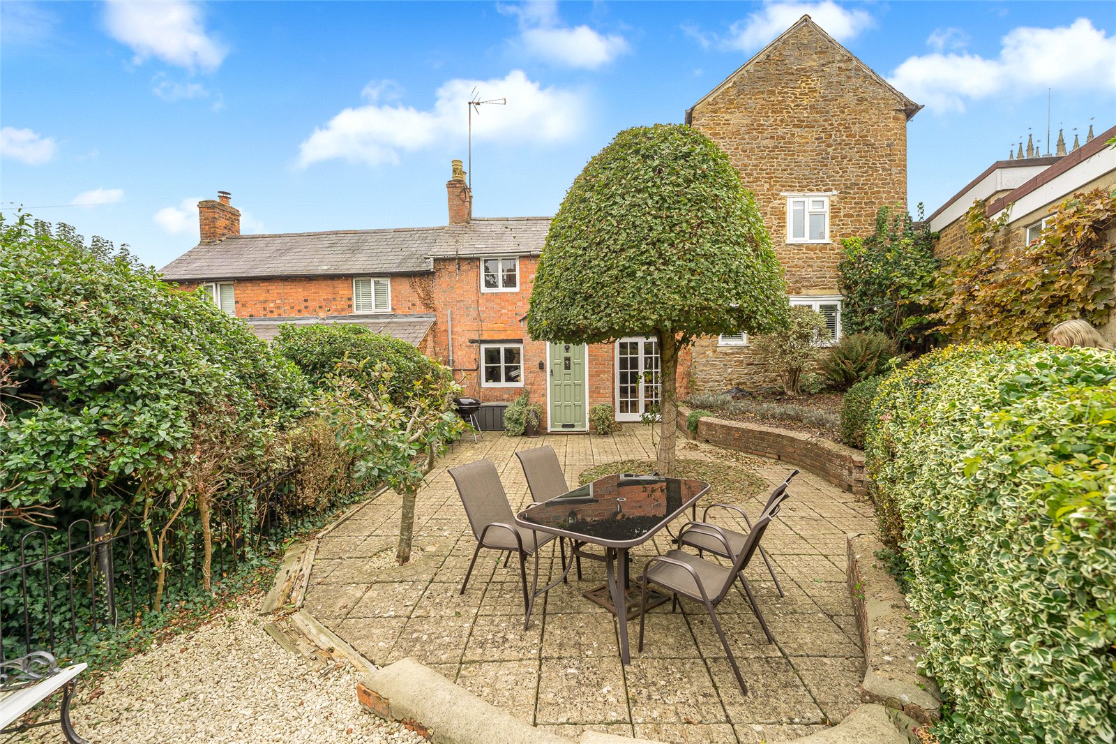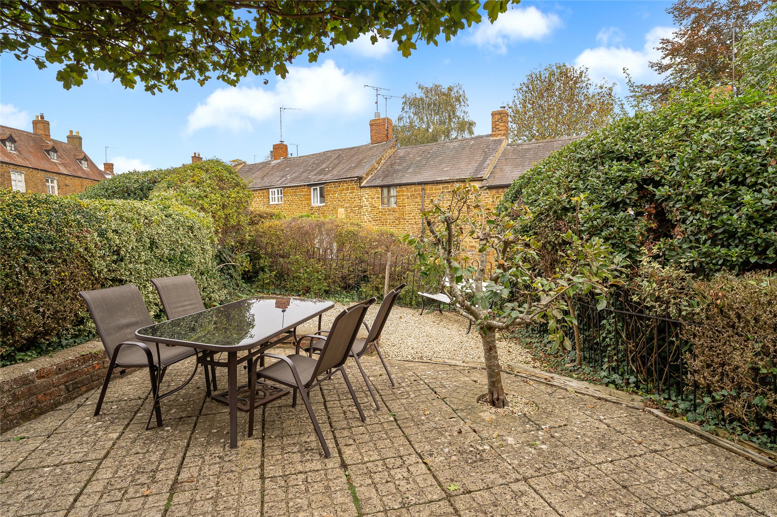 Front Garden: Set slightly elevated from the road and screened by mature hedging for privacy, the garden wraps around the front and side of the property. Mainly paved with stone hardstanding and a shingle seating area — perfect for outdoor dining. Includes a garden shed.