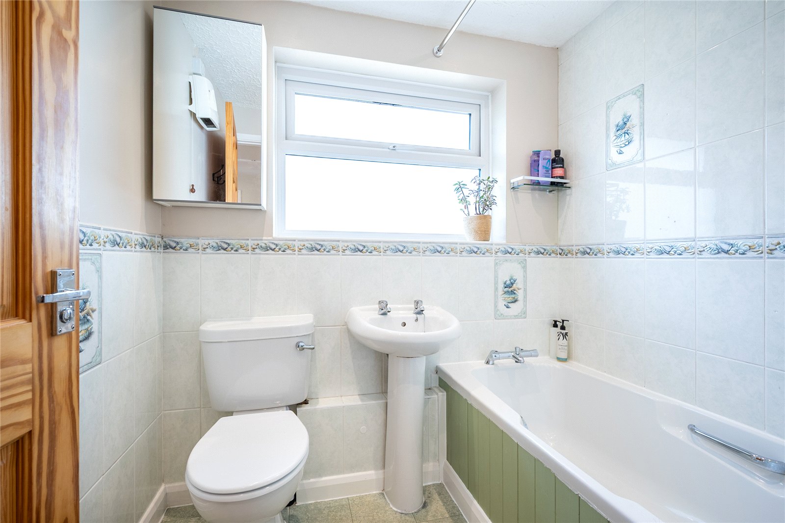 Comprising of panelled bath with shower over, low level W.C, pedestal hand wash basin and window to side aspect.