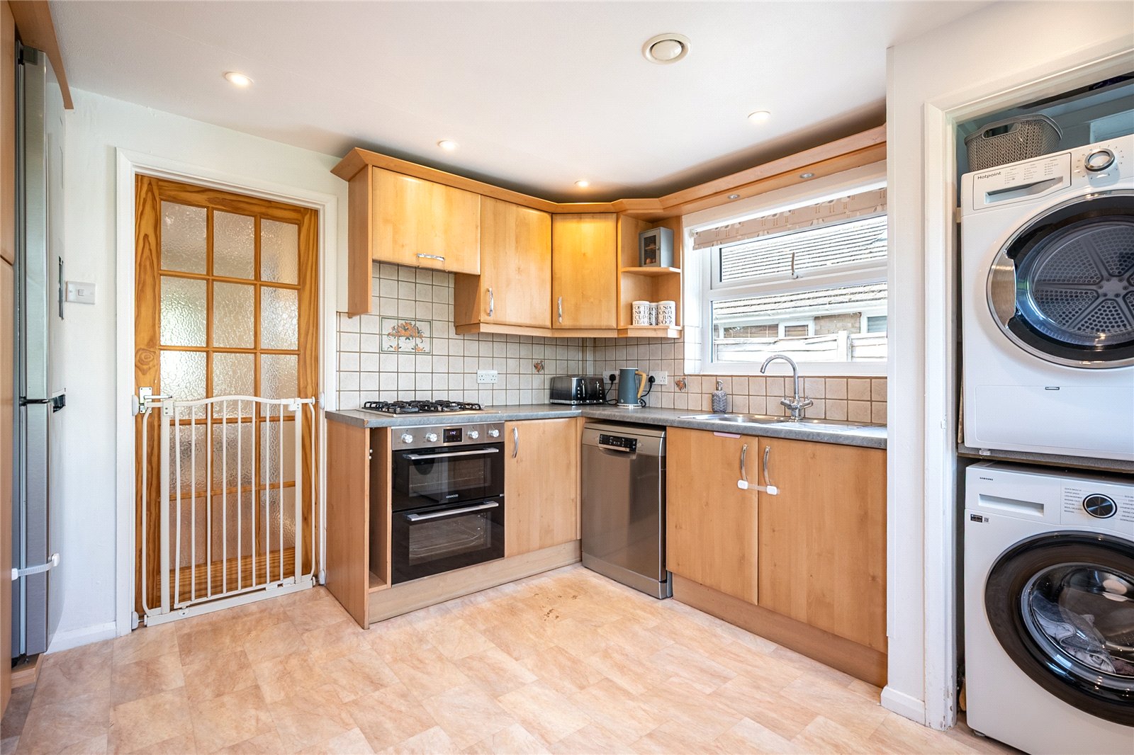 Fitted with a range of matching wall and base units with complementary work surfaces and part tiled walls. Integrated appliances include a oven/grill, gas hob with extractor hood above. There is plumbing for dishwasher, washing machine and tumble dryer and space for a tall fridge/freezer.