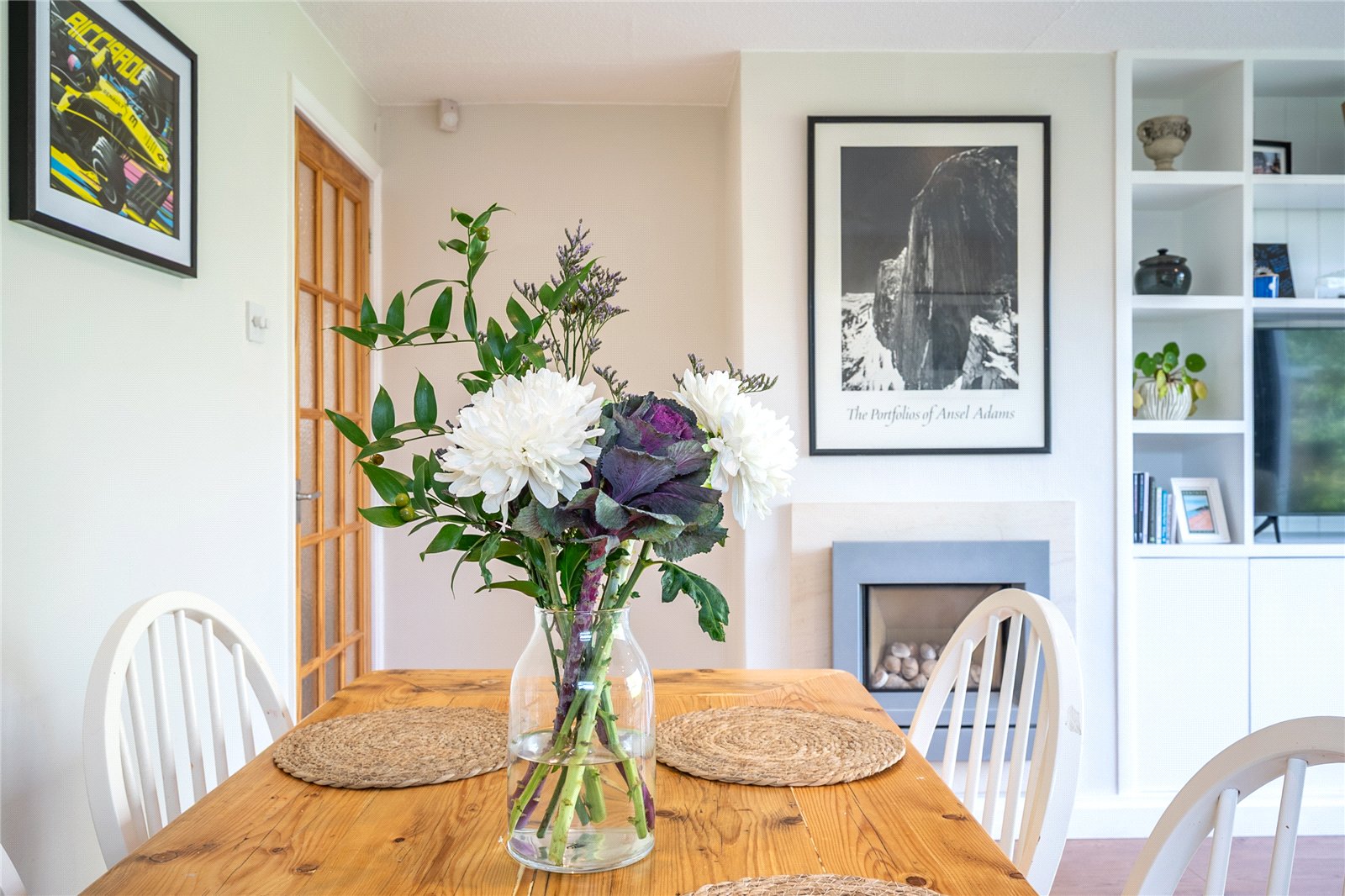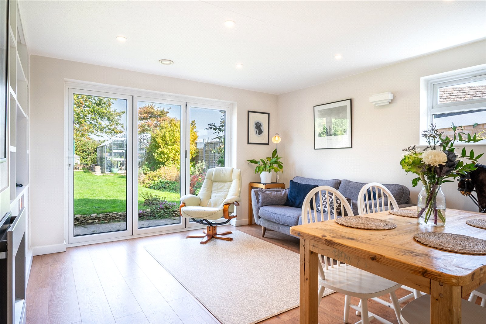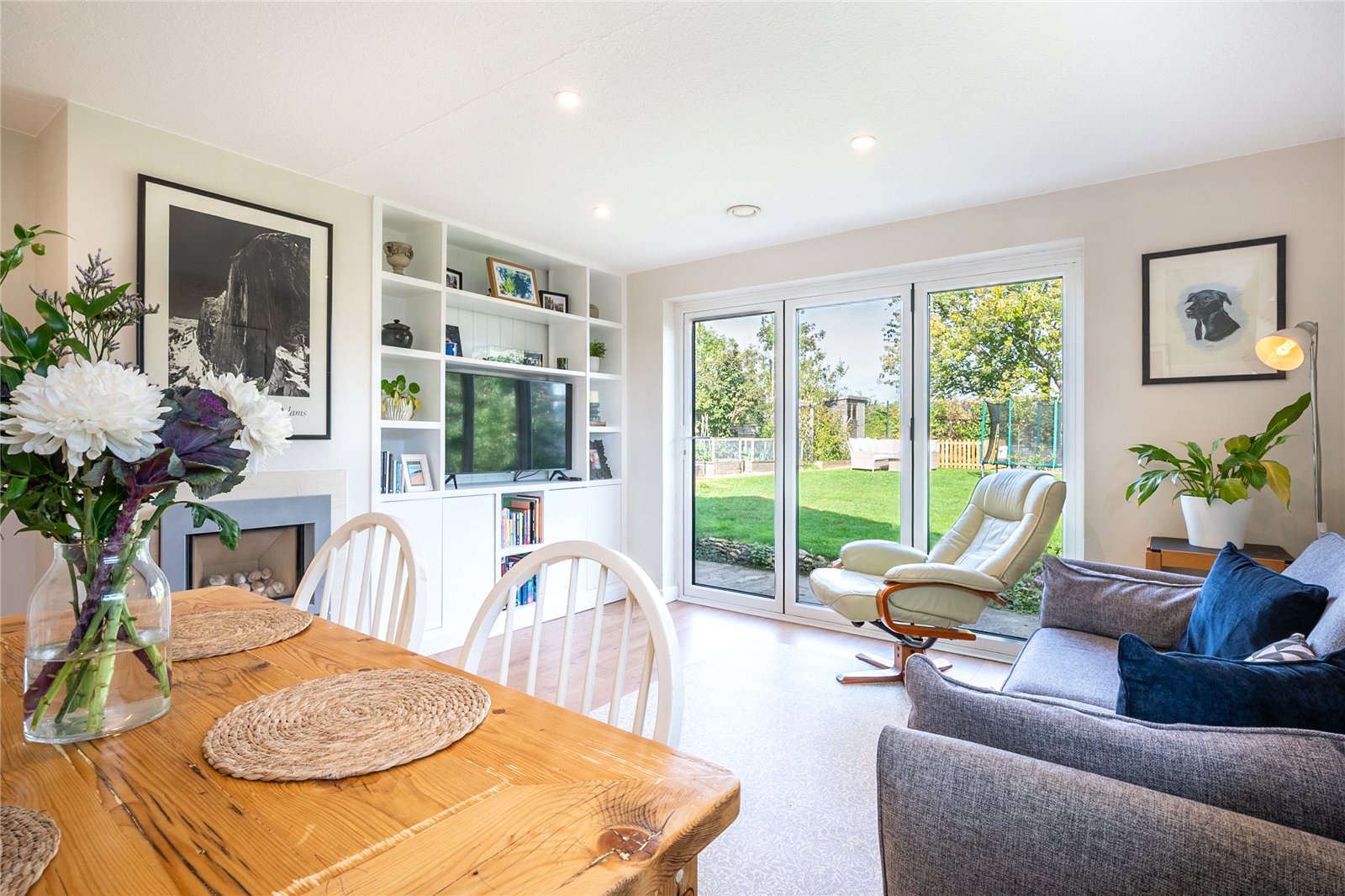 Complemented by neutral décor, recessed lighting, and attractive flooring throughout. Large glazed bi-fold doors open directly onto the garden, allowing an abundance of natural light. Feature fireplace and built-in shelving add both character and practicality.