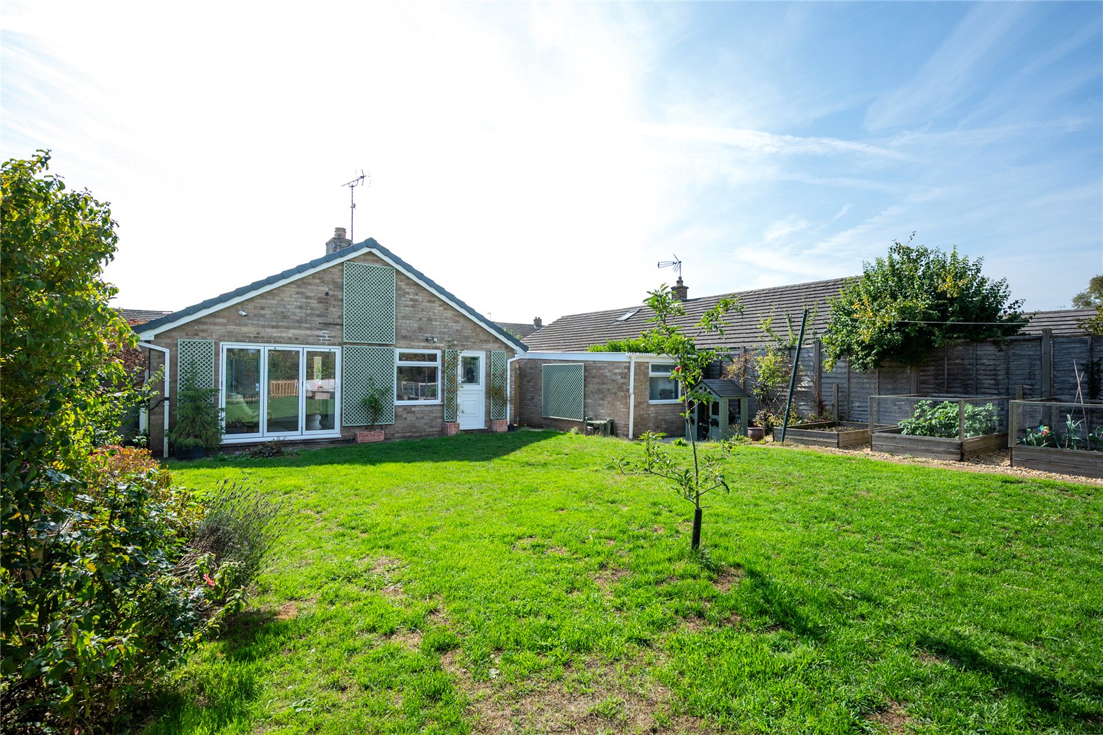 The private rear garden is predominantly laid to lawn, featuring a mixture of vegetable plots alongside established flower and shrub borders.