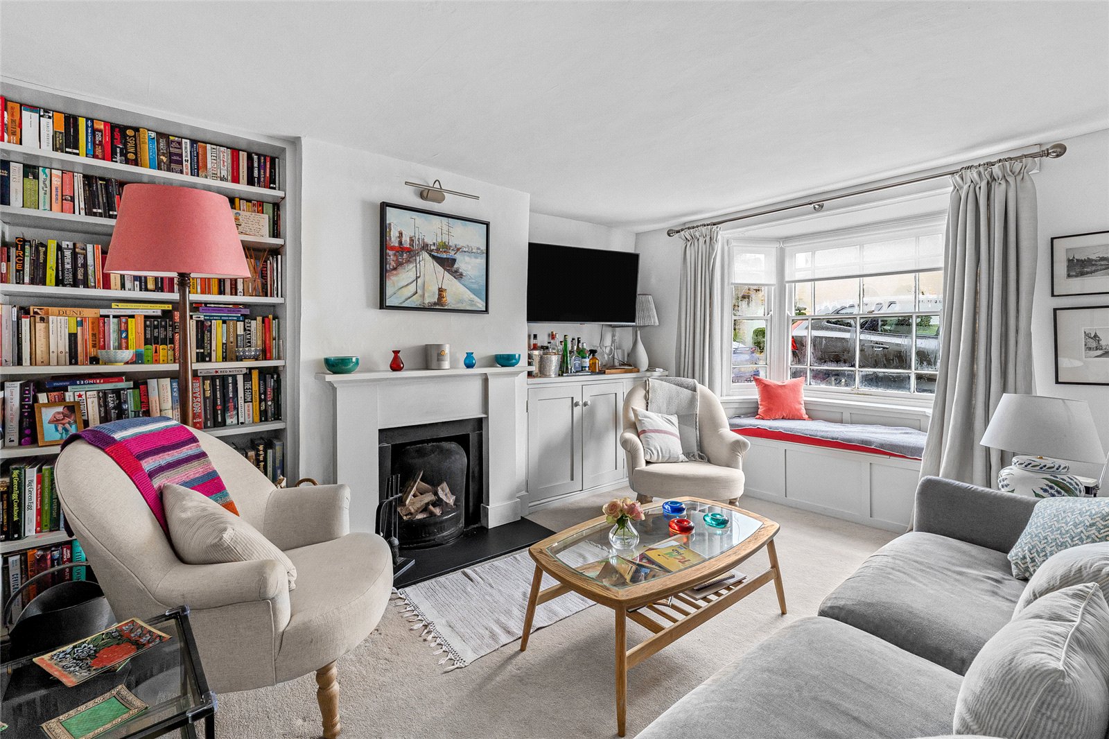 Sitting Room: Bay window to front aspect with window seat, open fireplace with slate hearth, built-in bookshelf into chimney recess.