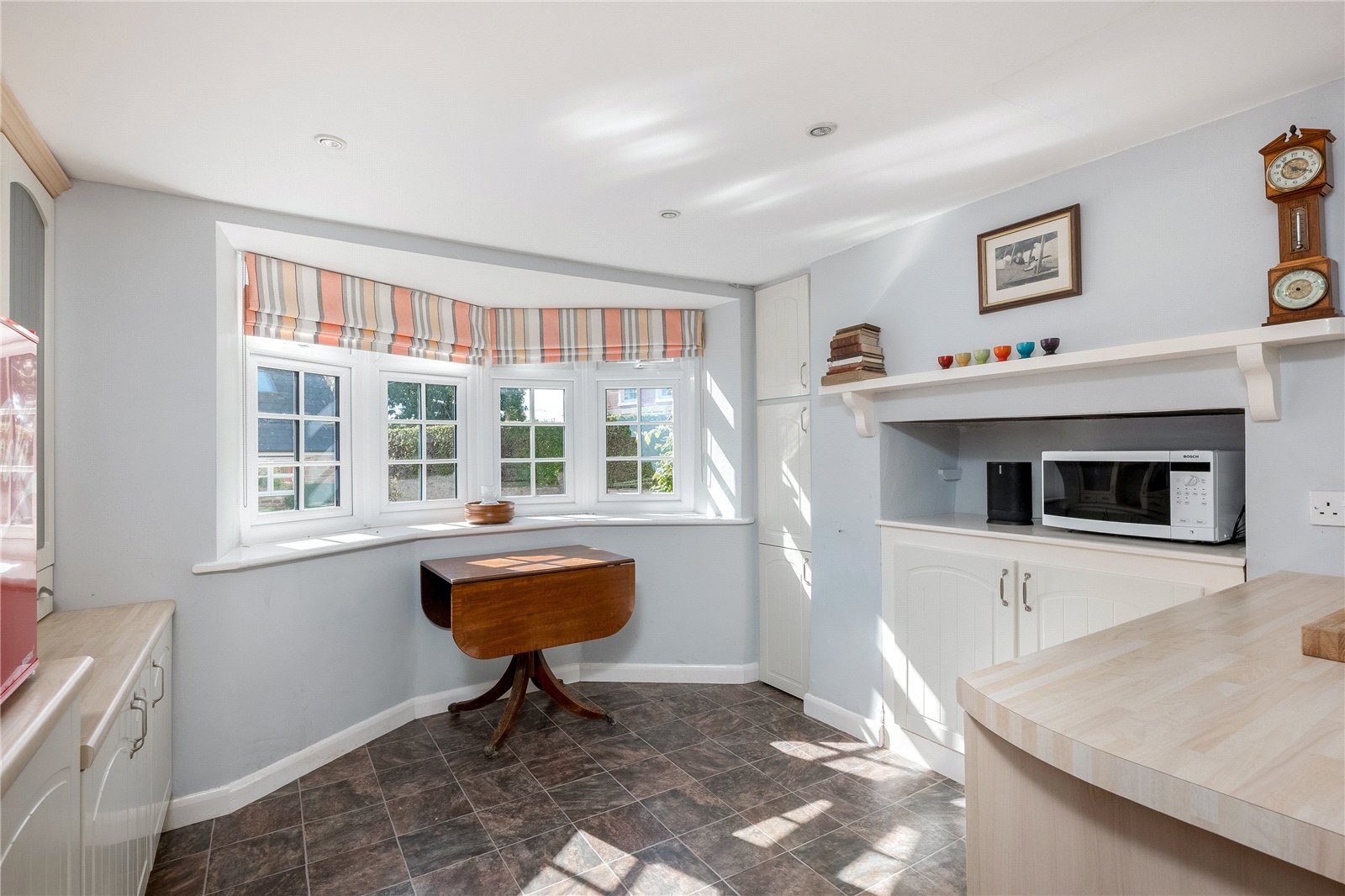 Kitchen/Dining Room: Fitted with a range of mounted wall and base units with work surfaces, part tiled walls, built-in electric hob with oven below and extractor hood above, integrated fridge/freezer, tiled floor, double glazed bay window to front aspect, double glazed window and door to rear aspect, wall mounted gas central heating boiler.