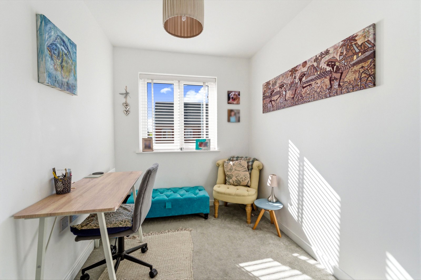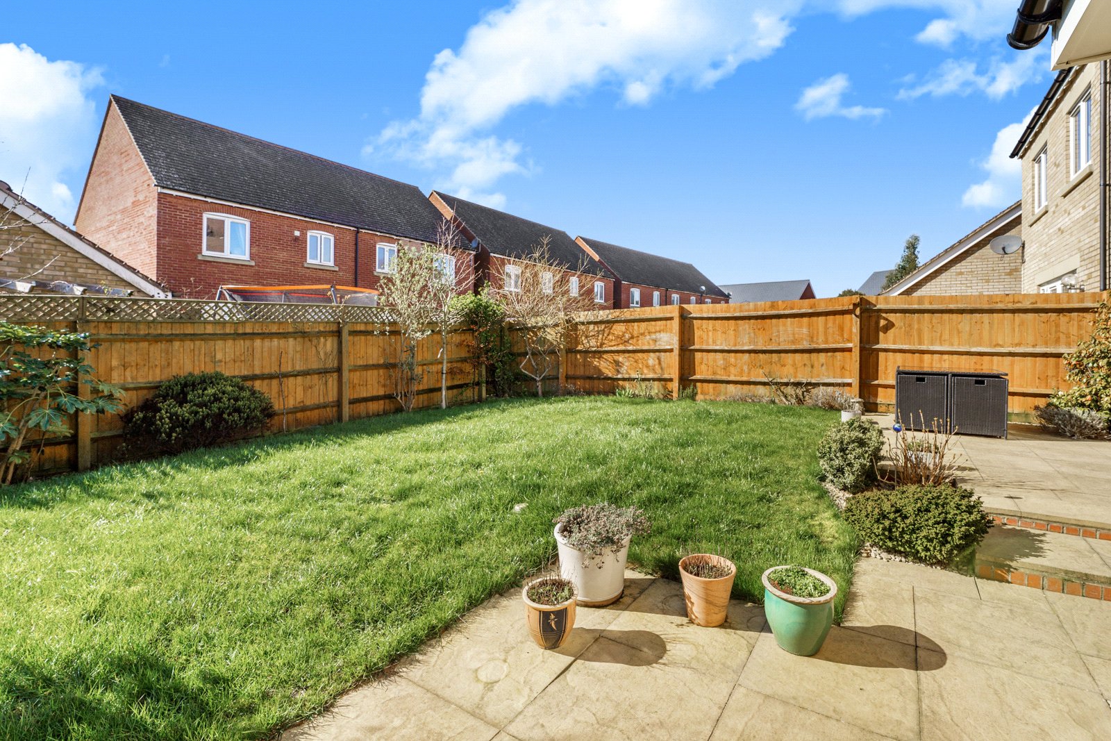 Rear Garden: Fully enclosed and south-west-facing with a paved patio, neat lawn with flower and shrub borders, outside light and tap, and electric sun awning over the patio doors.