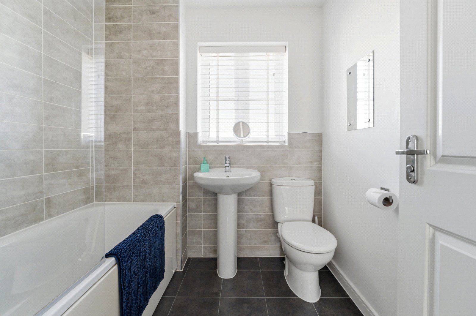 Family Bathroom: Comprising a white suite with panelled bath and separate shower over, pedestal wash hand basin, part-tiled walls, tiled flooring and double-glazed window to the front aspect.