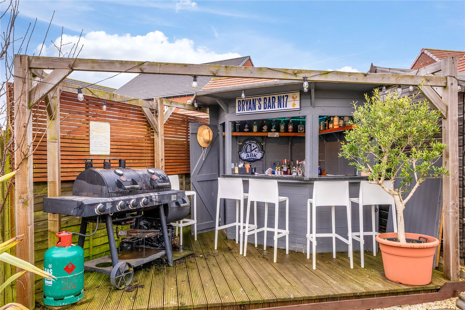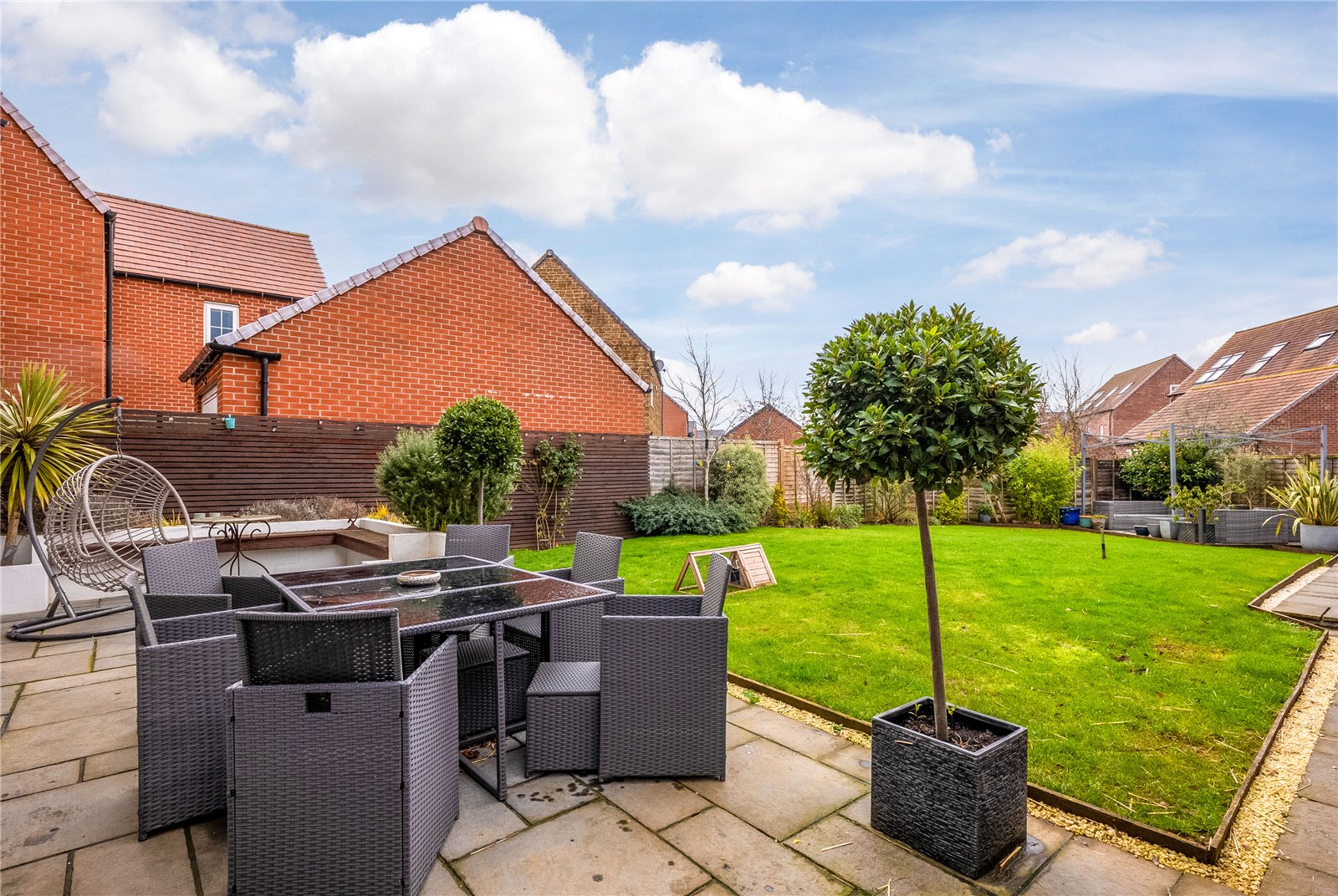 To the rear is a private garden designed with family living and entertaining in mind, featuring a patio seating area and a lawned garden.