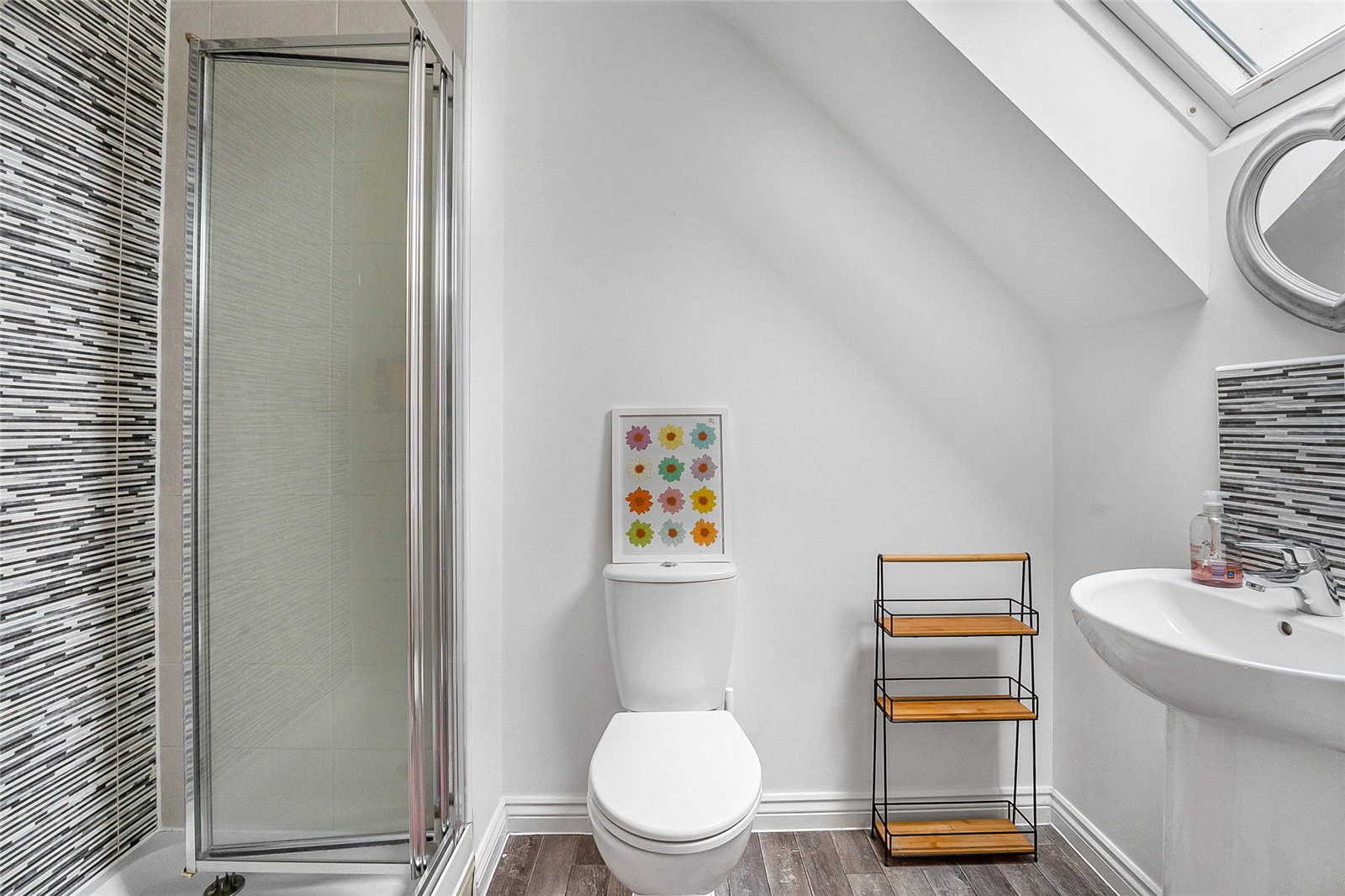En-Suite Shower Room – Comprising of White Suite of Double Shower Cubicle with Shower Over. Pedestal Hand Wash Basin. Low Level WC. Part Tiled Walls. Double Glazed Velux Window to Rear Aspect.