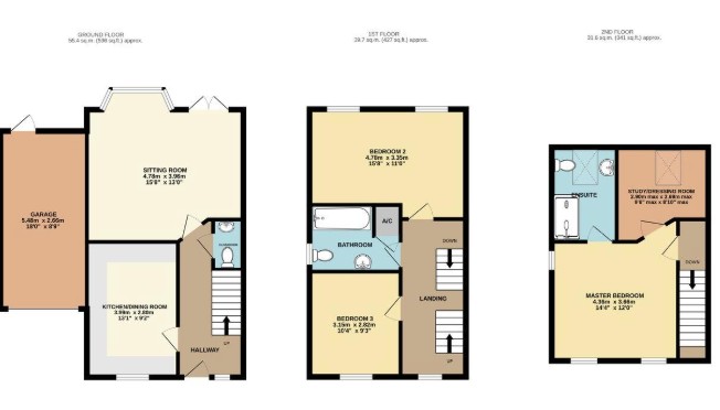 The top floor features the principal bedroom, showcasing a clever use of space with an en suite and a separate study/nursery area, which could also be used as a walk-in wardrobe.