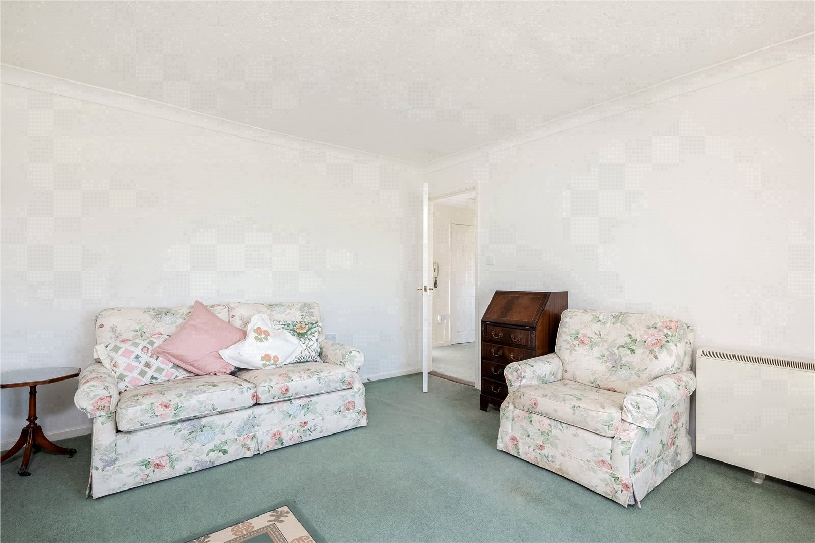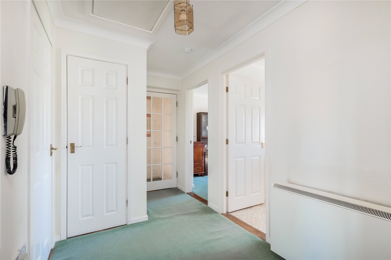 Hallway: Access to boarded loft space with built-in loft ladder, built-in airing cupboard, built-in cupboard, entry phone system, electric economy 7 wall mounted heated.