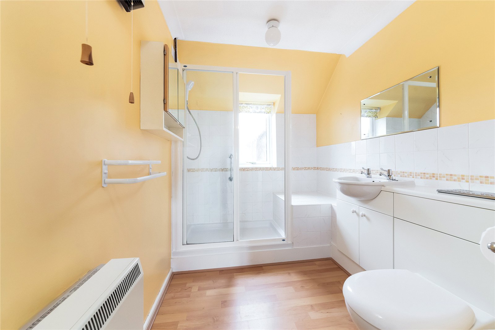 Shower Room: Comprising of white suite of double shower cubicle with shower over, hand wash basin with vanity unit below, low level WC, part tiled walls, and double glazed window to rear aspect.
