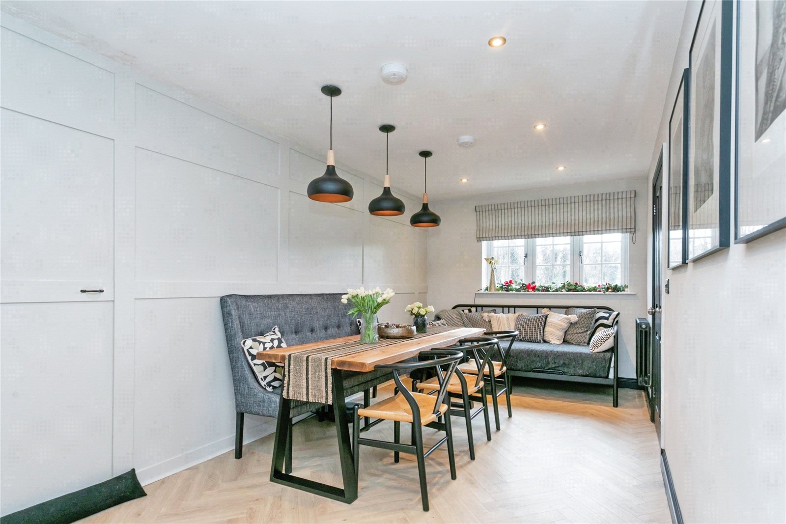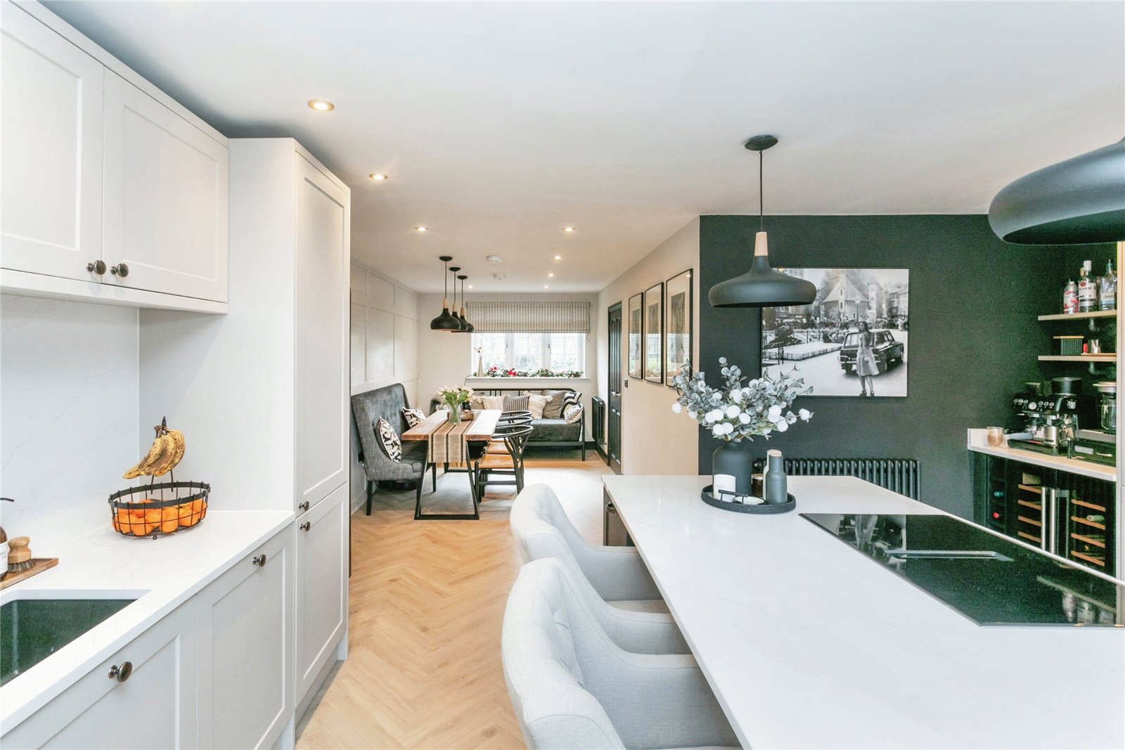 Kitchen/Dining Room – Recently fitted Kitchen, inset sink unit with quooker tap, range of matching wall and base units with quartz worksurfaces. Range of integrated appliances including Neff induction hob, integrated extractor unit within the central island with cupboards and draws below. Breakfast bar, larder fridge & freezer, dishwasher and bins, double glazed window to front aspect, double glazed french door with windows either side to rear garden, part panelled walls, secret door to