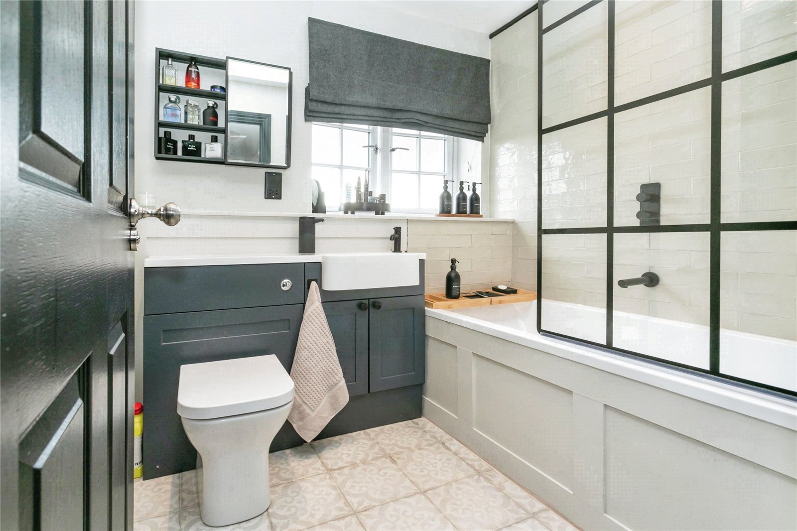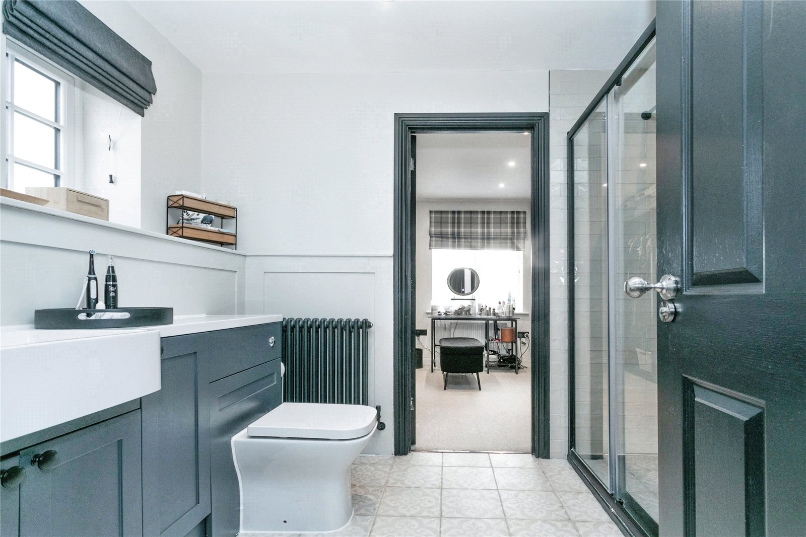 Family Bathroom – White suite comprising panelled bath with separate rain shower over, hand wash basin with vanity unit below, low-level W.C., part tiled and part panelled walls, mosaic tiled floor, double glazed window to front aspect.