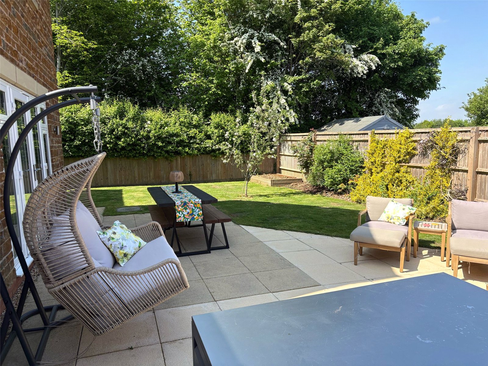Rear garden – Fully enclosed and private with extended paved patio area, lawn, well-stocked flower and shrub borders, outside lighting and electricity, storage sheds, enclosed by panelled fencing.