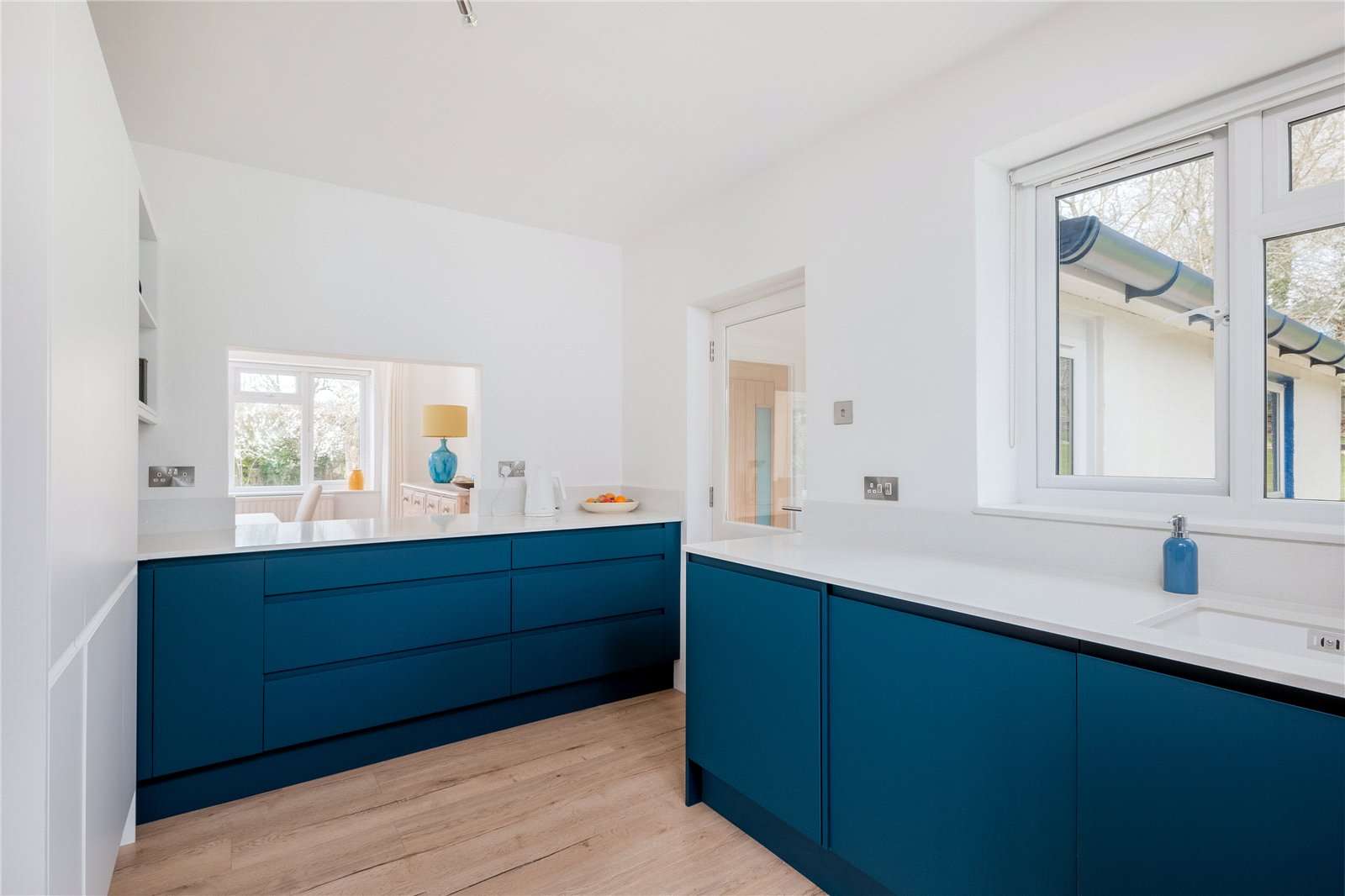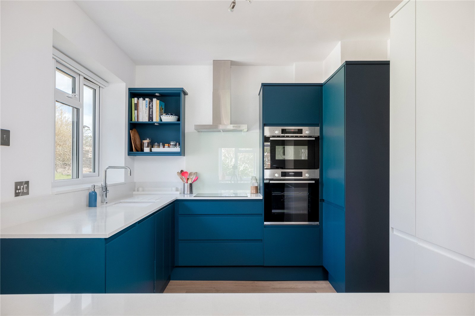 Kitchen: Fitted with a Howdens Kitchen with a range of integrated appliances including an electric induction hob with extractor hood above, Bosch electric oven, Bosch combination microwave oven, dishwasher, washing machine, fridge/freezer, two pull-out larder cupboards, laminate floor, double glazed window to rear aspect, half glazed door to