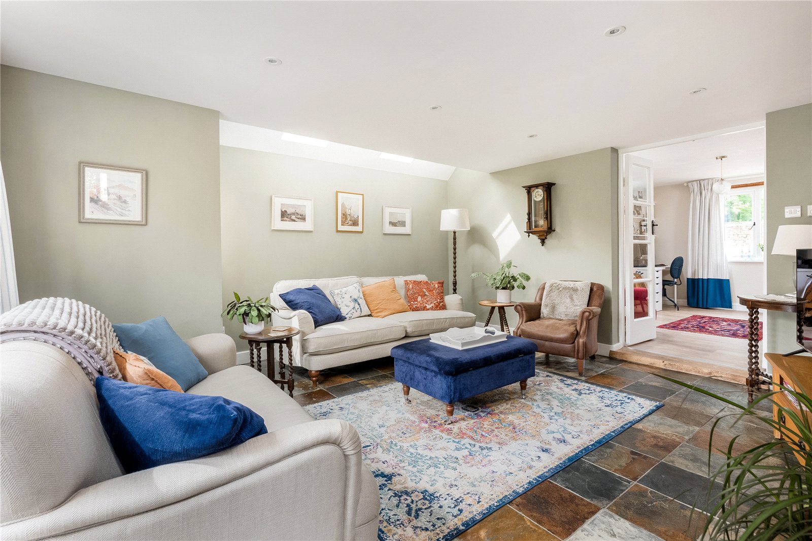 Sitting Room: Attractive fireplace with electric coal effect fire, tiled floor, underfloor heating, double glazed French doors to rear garden, double glazed window to rear aspect, two double glazed Velux windows to side aspect.