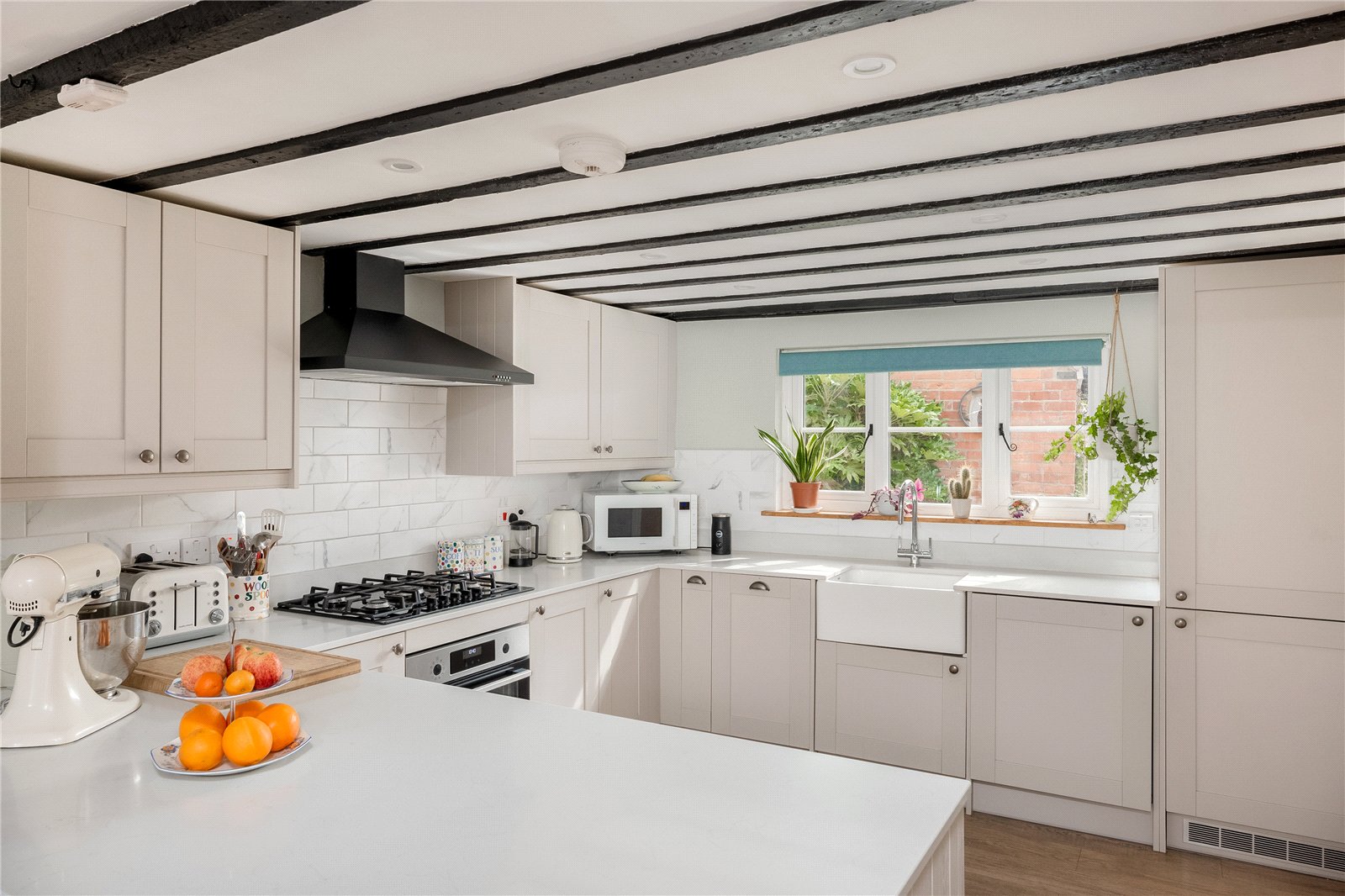 Kitchen Area: Wren kitchen fitted with butlers sink with cupboard underneath, range of mounted wall and base units with quartz worksurfaces, inset five ring gas hobs with electric oven below and extractor hood above. Inset fridge/freezer, plumbing for washing machine and dishwasher, exposed beam ceiling, double glazed window to rear aspect, insulated wooden floor, door to