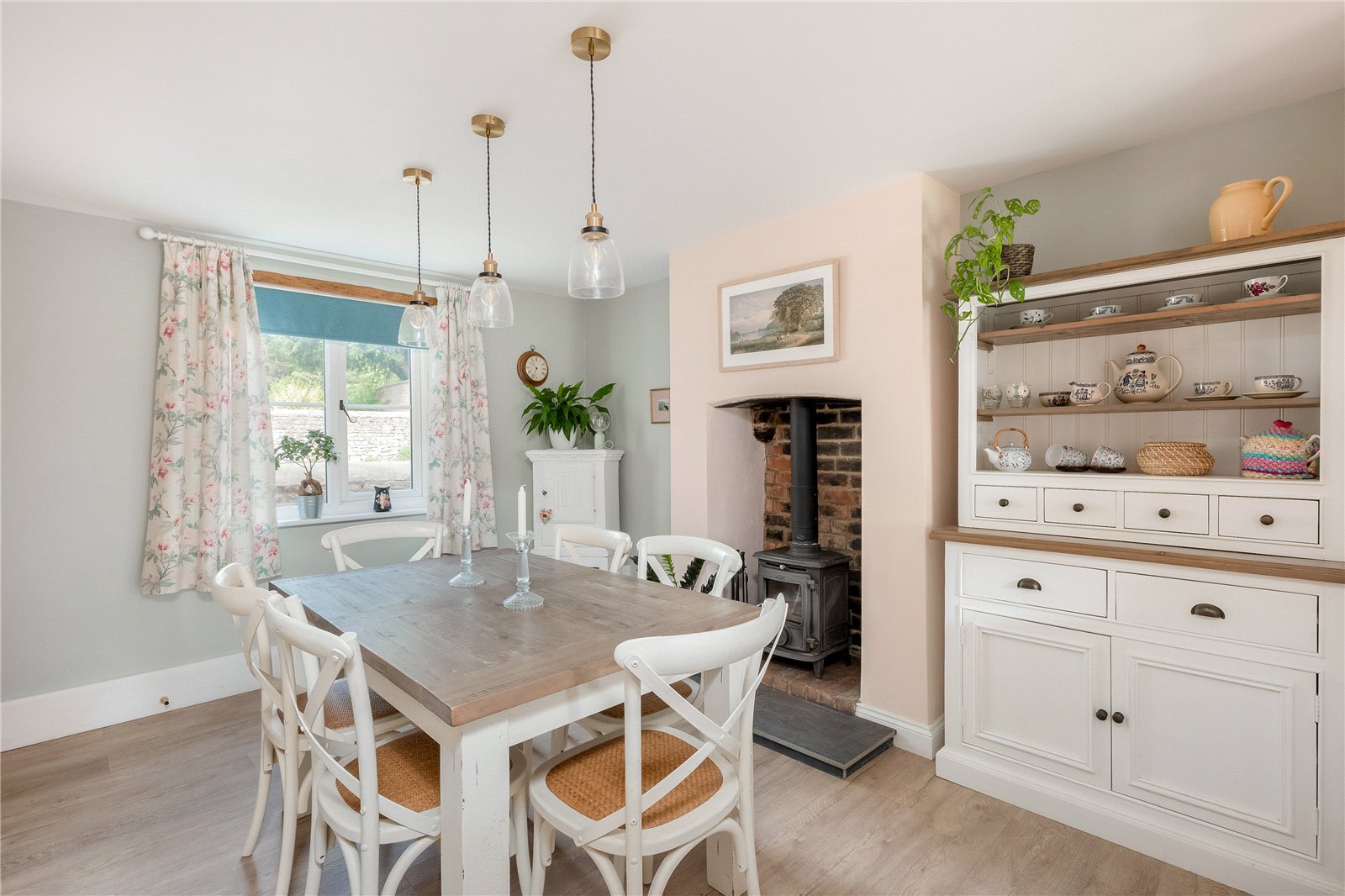 Kitchen/Dining Room: Attractive fireplace with log burning fire, wooden floor, underfloor heating to the dining area, double glazed window to front aspect, large understairs cupboard.