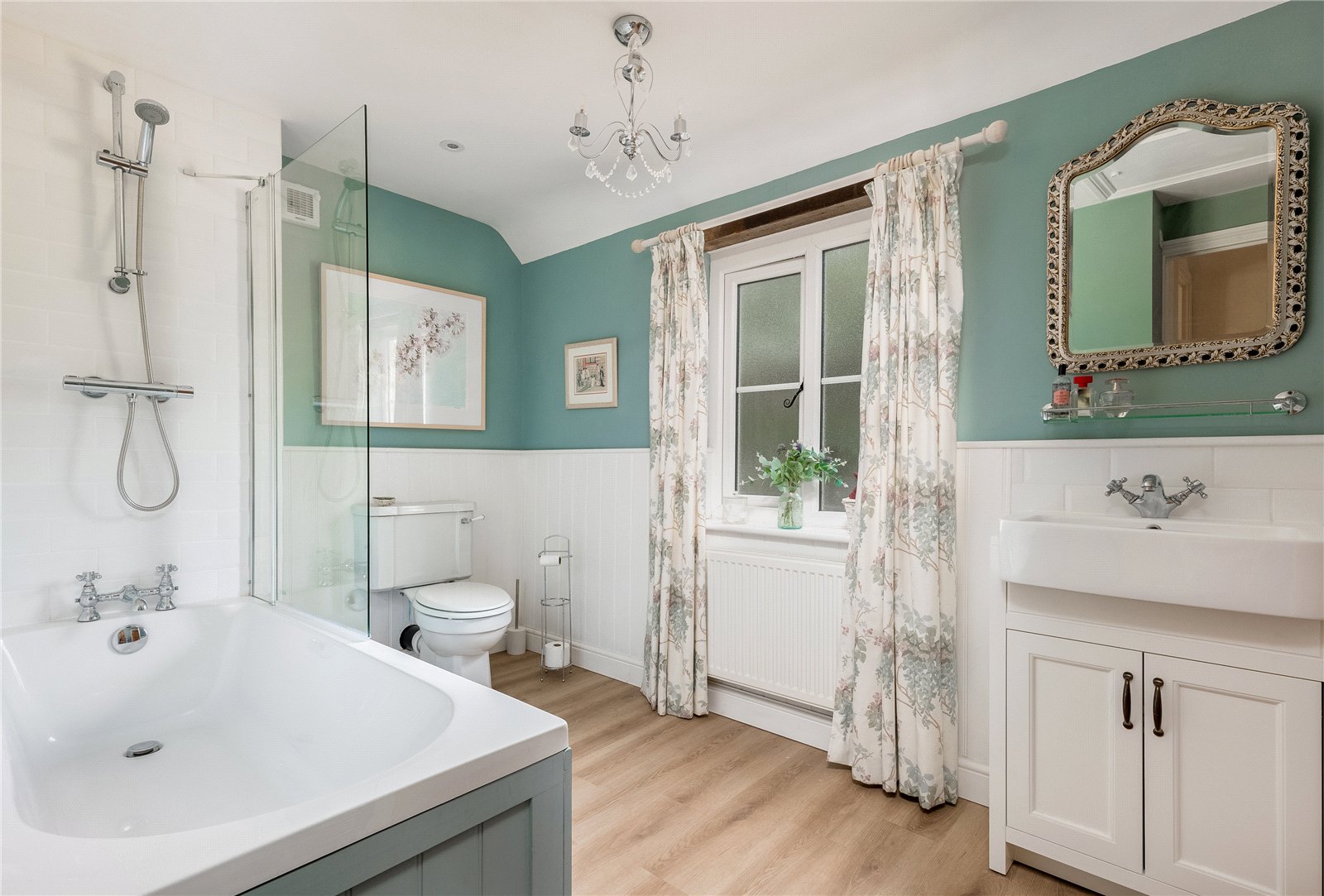 Large Family Bathroom: Comprising of white suite of panelled bath with separate shower over, handwash basin with vanity unit below, low level WC, part tiled walls, double glazed window to front aspect, walk-in airing cupboard with radiator, access to loft space that houses the central heating boiler.