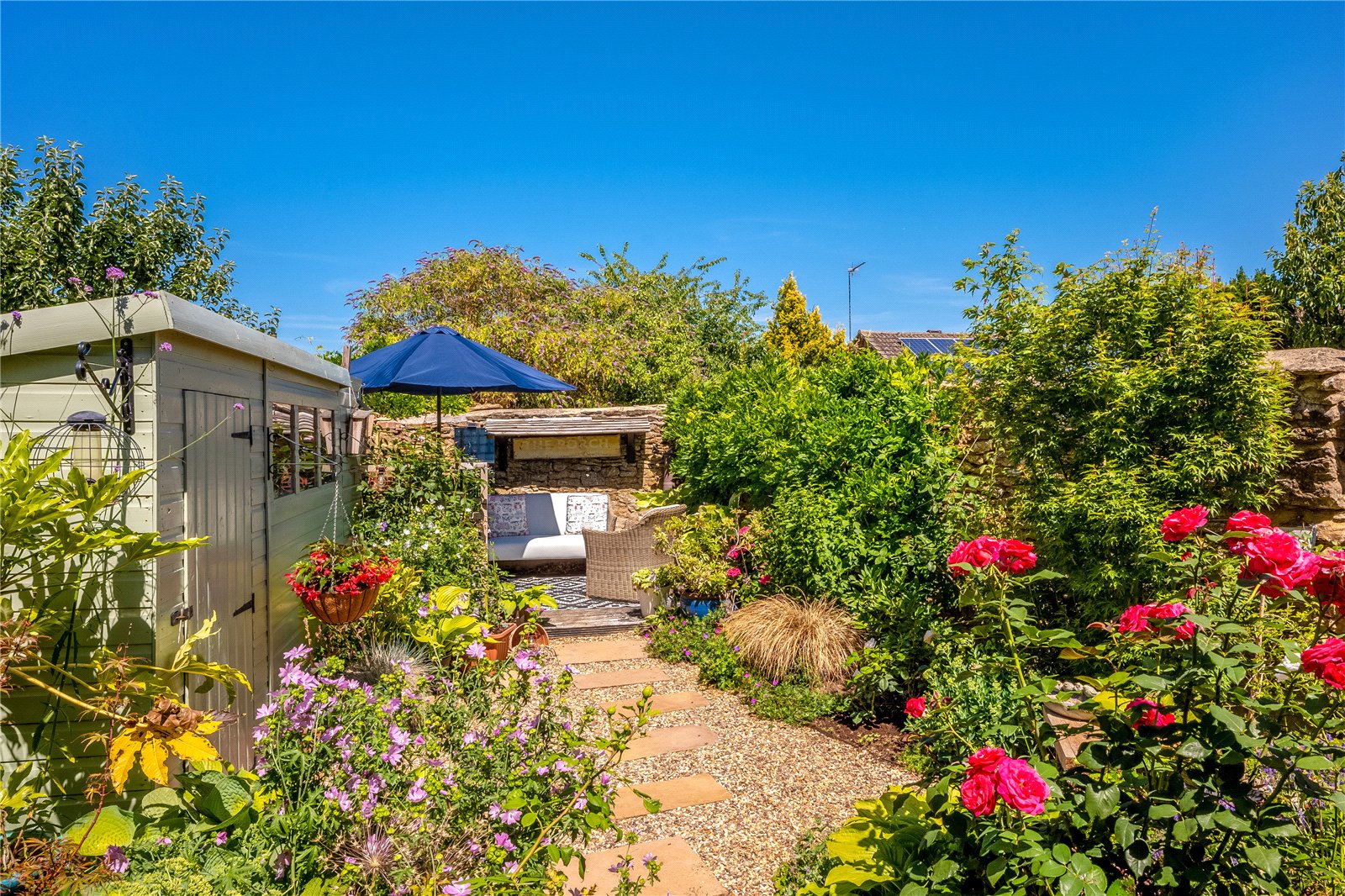 Rear Garden: This beautiful garden is not overlooked and easy to maintain with paved patio, gravel, stepping stones and shrub borders enclosed by an attractive stone wall. The timber garden shed has power, and there is also outside lighting and tap.