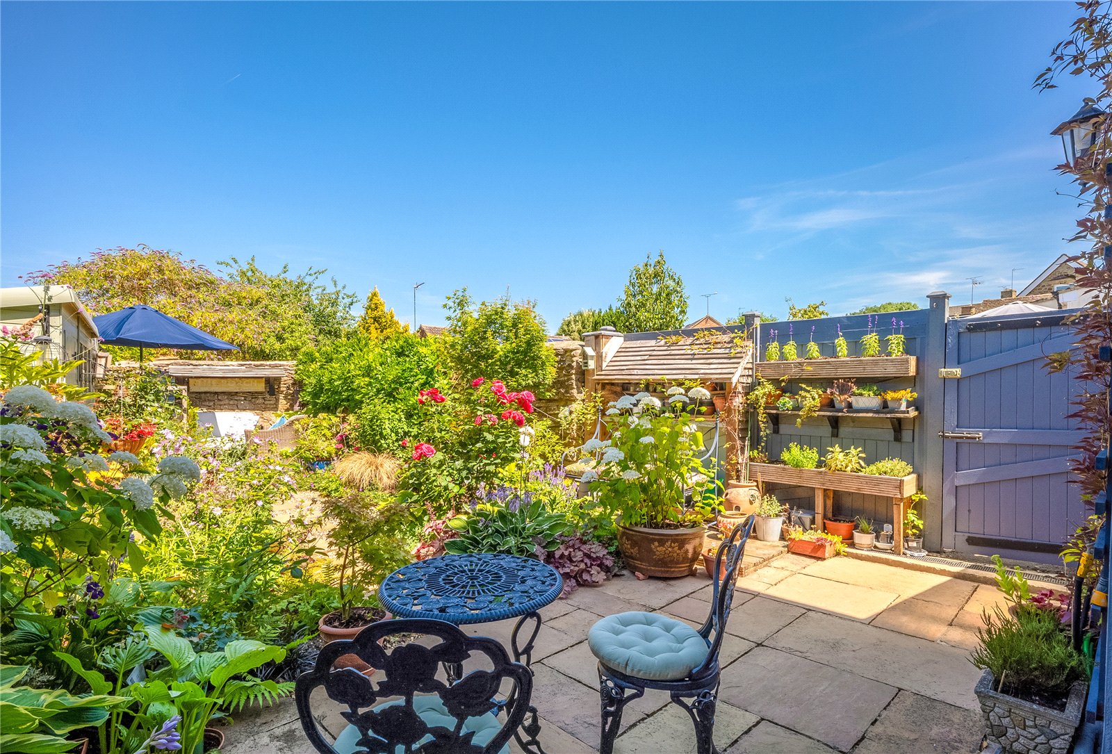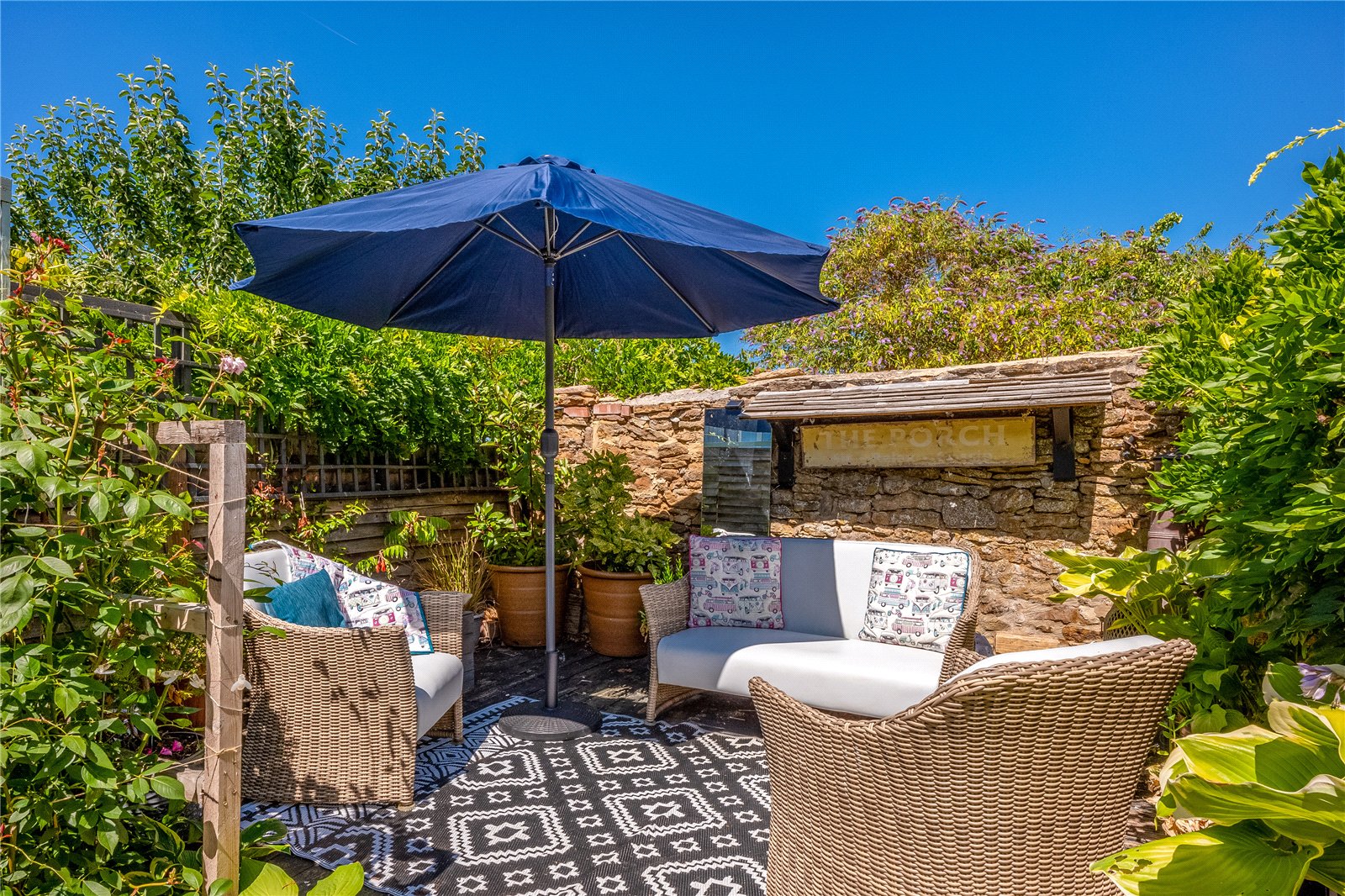 Rear Garden: This beautiful garden is not overlooked and easy to maintain with paved patio, gravel, stepping stones and shrub borders enclosed by an attractive stone wall. The timber garden shed has power, and there is also outside lighting and tap.