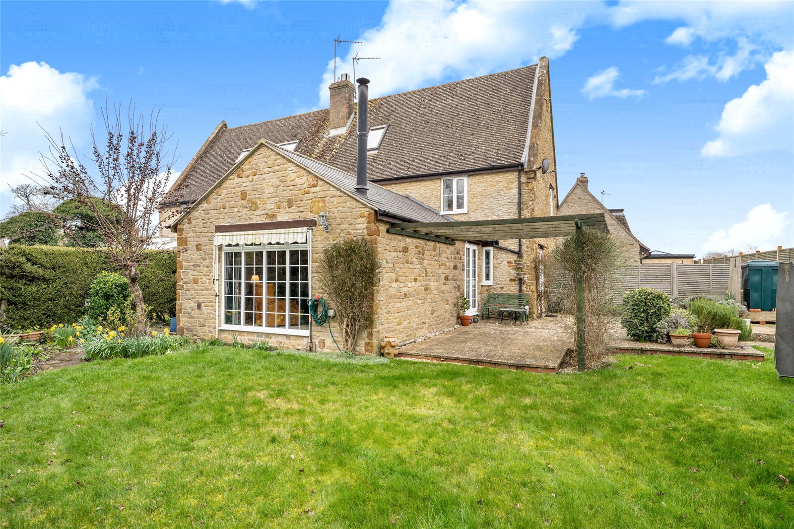 The property enjoys a generous enclosed rear garden, mainly laid to lawn with mature planting and established borders, offering a private and peaceful outdoor setting. A patio terrace provides an ideal space for outdoor dining and entertaining.