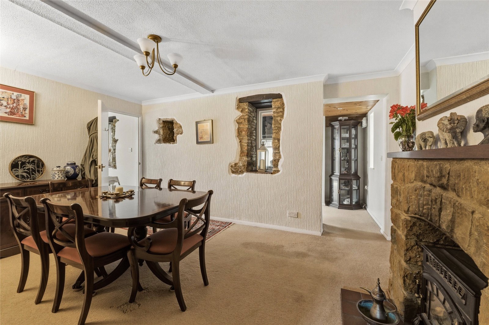 A generous dining room sits at the heart of the home, featuring original stonework and providing an excellent space for formal dining. The beautifully appointed kitchen/breakfast room is fitted with a range of units and integrated appliances and offers dining space, with access out to the garden.