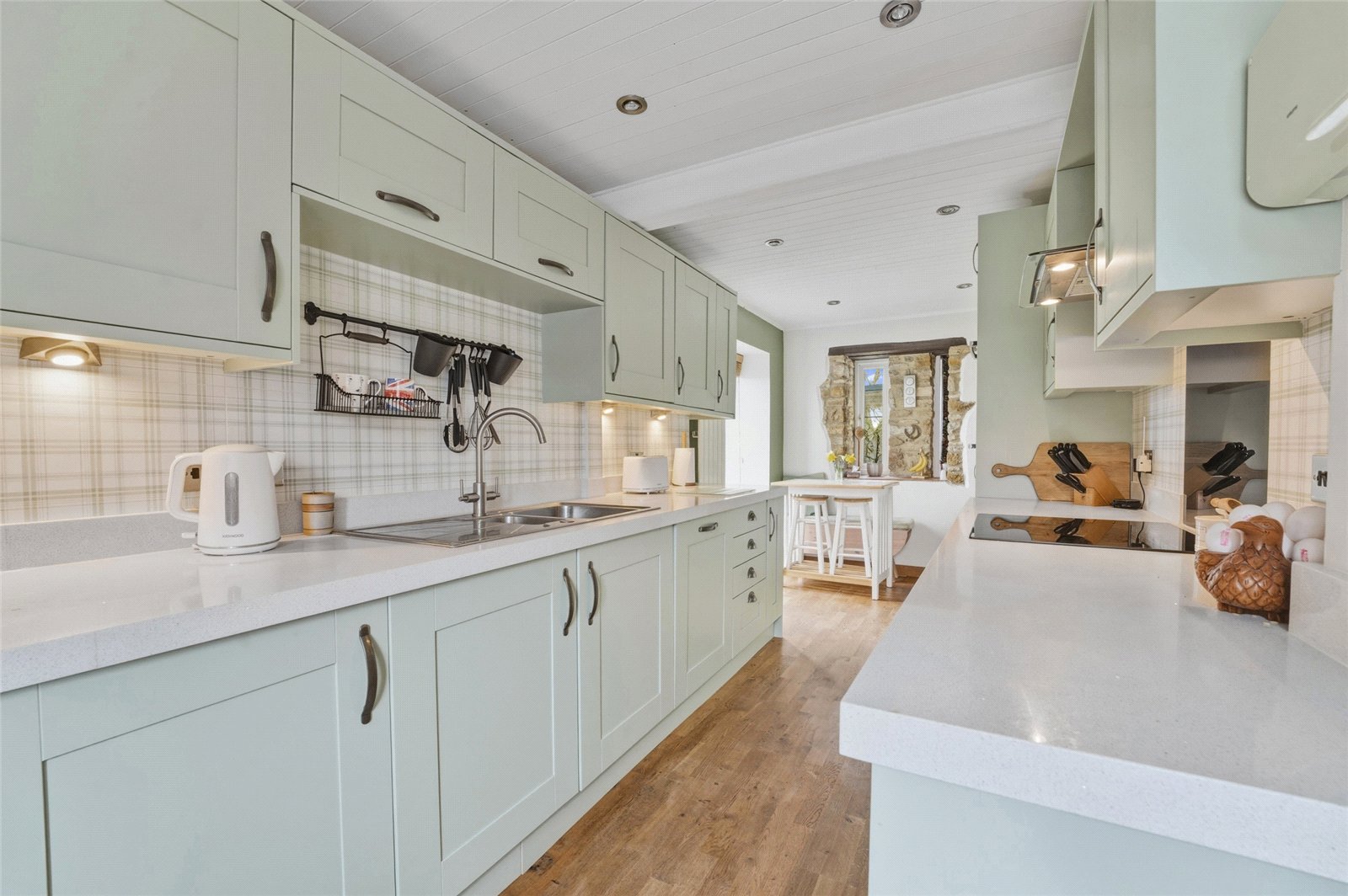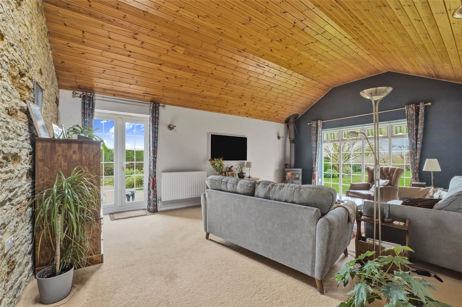 The sitting room is a particularly impressive reception space with exposed stonework, high ceilings and large windows. Doors open directly onto the garden, while a cosy log burner creates a warm and inviting atmosphere.