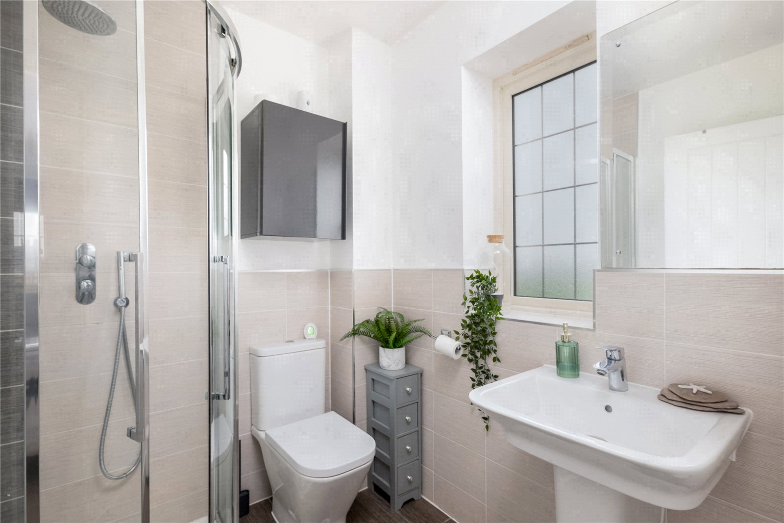 Comprising of a pedestal hand wash basin, low level W.C, panelled bath, separate shower cubicle, and window to front aspect.