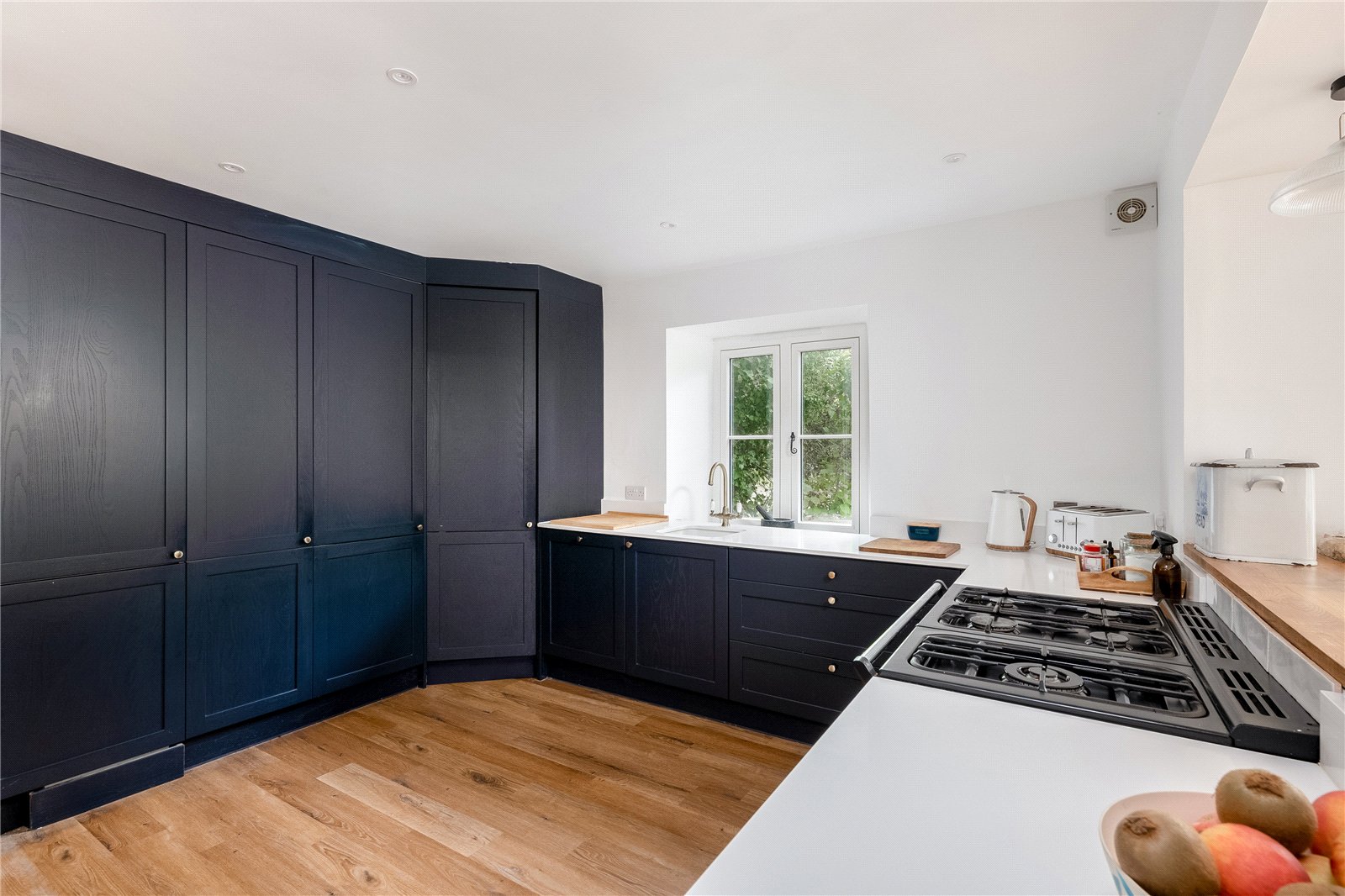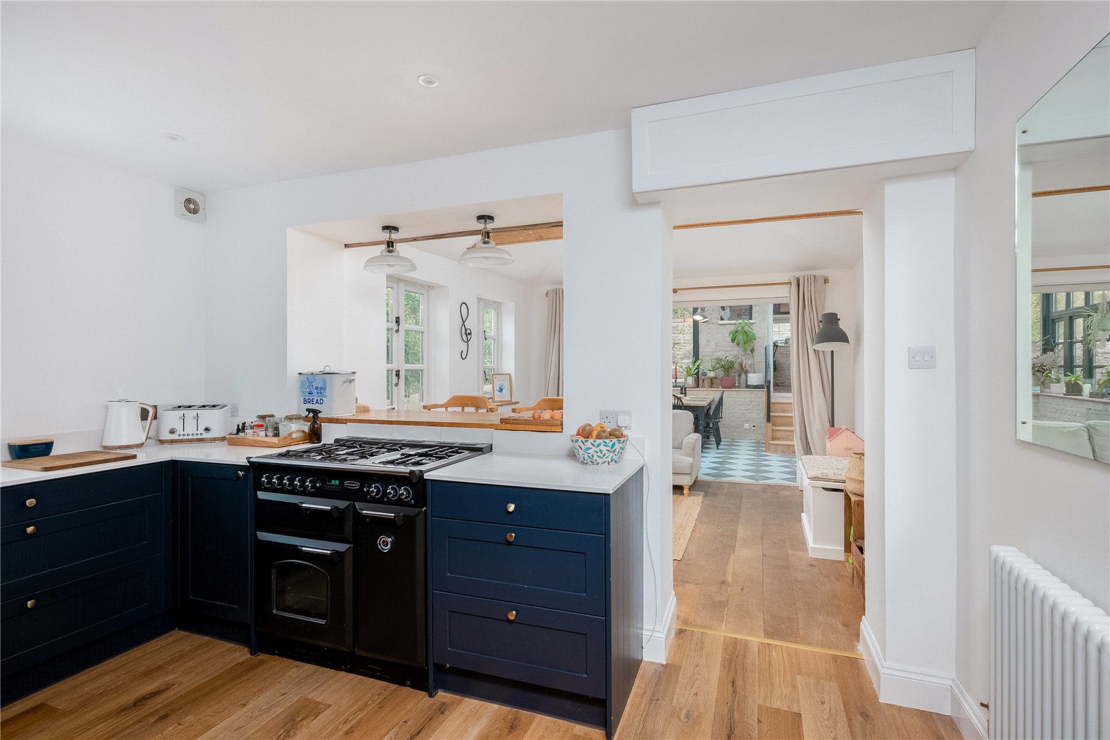 Kitchen: Fitted with a range of base units with quartz worksurfaces, range of tall standing units including a corner pantry. Integrated range cooker, fridge/freezer, and dishwasher. Wooden floor, arch with oak worksurfaces and doorway through to