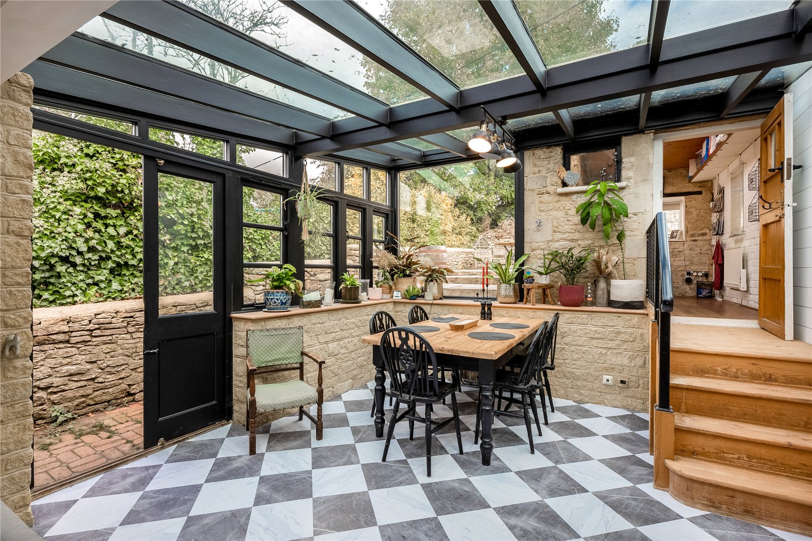 Dining Area/ Conservatory: Of stone and double glazed construction with double doors to rear garden, steps up to