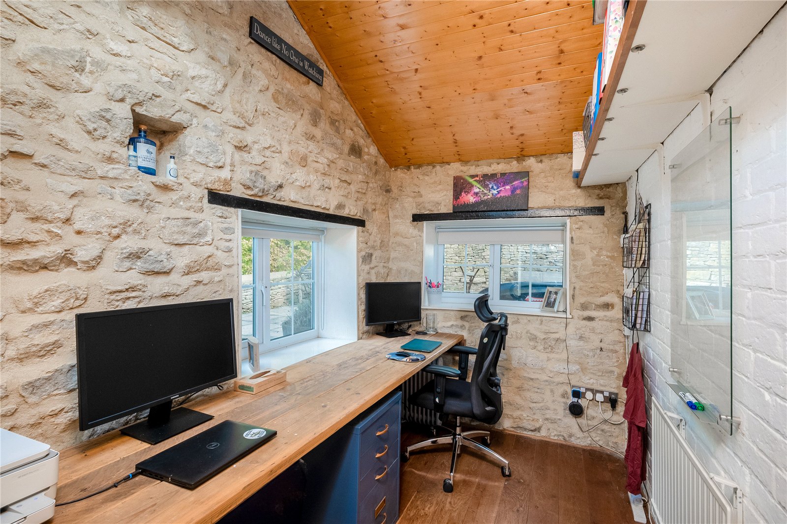 Study: Wooden floor with underfloor heating, double glazed windows to rear and side aspect, pitched ceiling with Velux double glazed window, exposed brick and stone walls, stable door to rear garden.