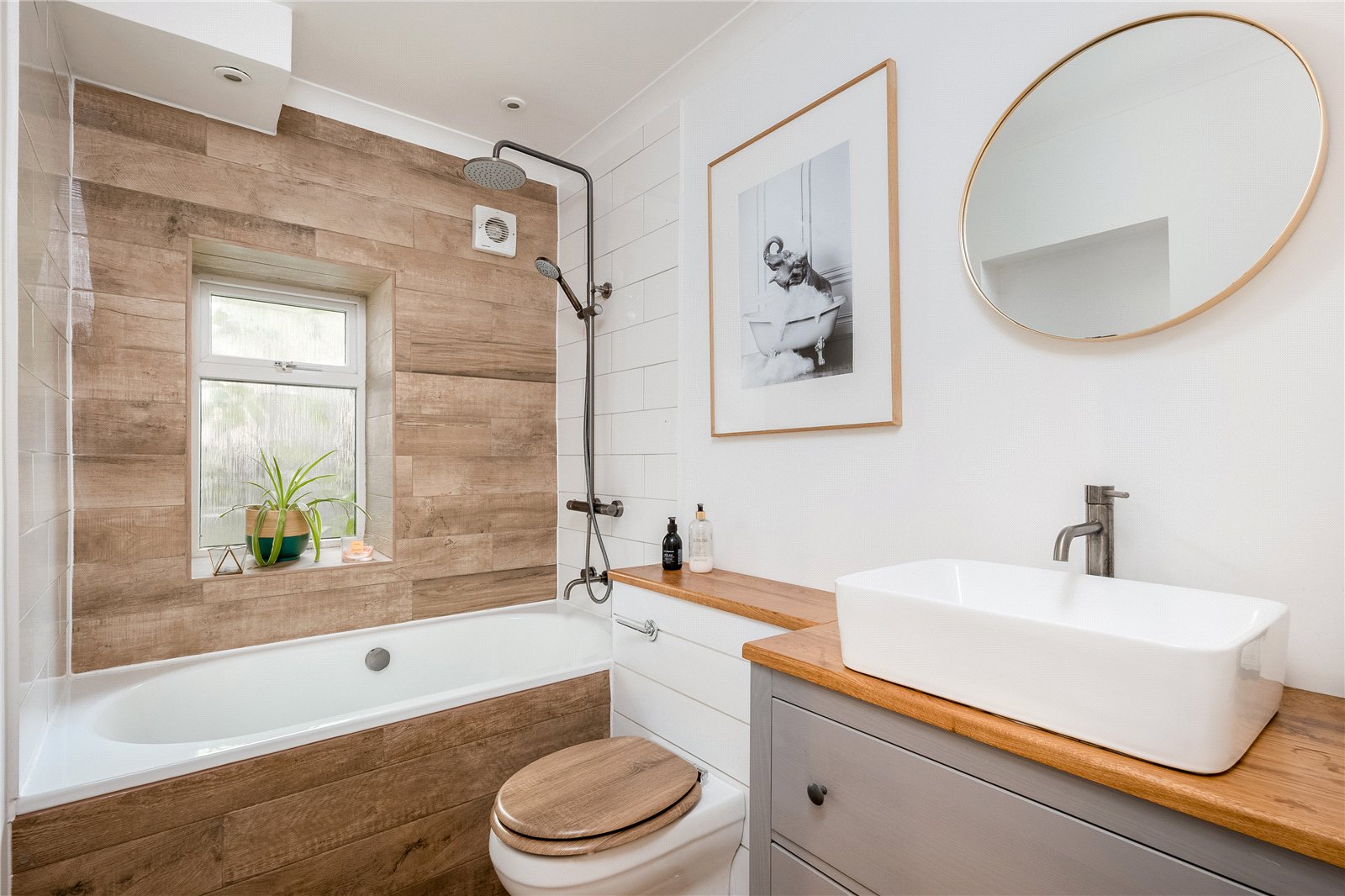 Bathroom: Comprising of white suite, panelled bath with separate shower and rain shower over, low level WC, hand wash basin with vanity unit below, double glazed window to rear aspect, part tiled walls.