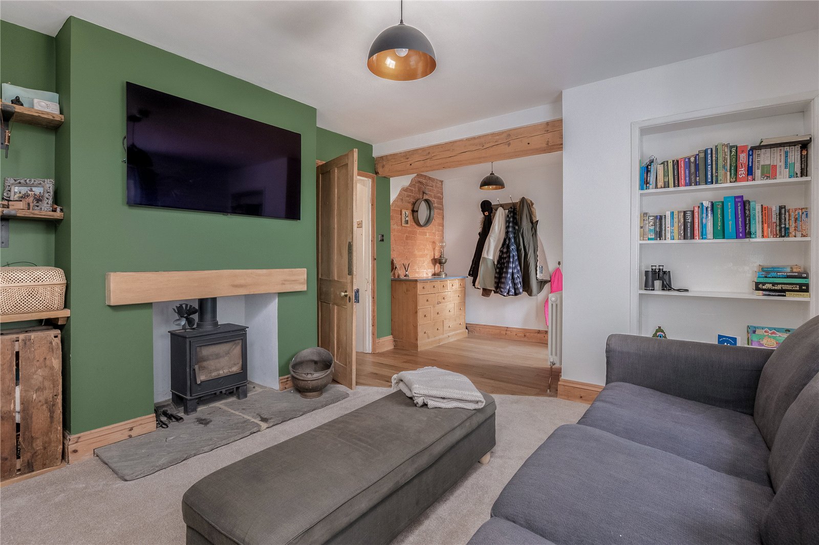 Sitting Room: Attractive woodburning fire with slab hearth, double glazed windows to front and side aspect, part exposed brick wall, wooden flooring, door to