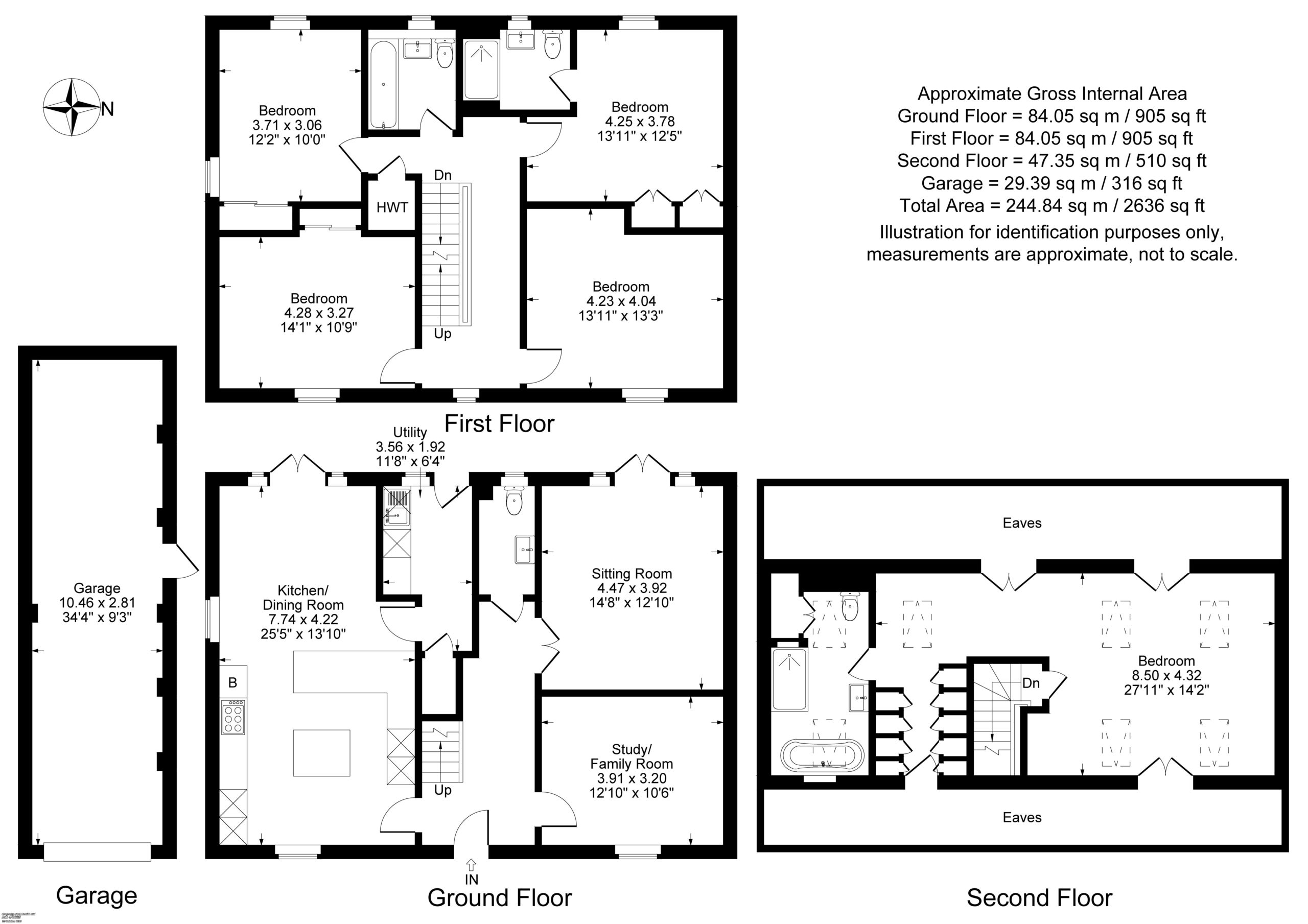 Family Bathroom: Comprising of white suite of panelled bath with shower over, pedestal hand wash basin, low level WC, part tiled walls, sash window to rear aspect.