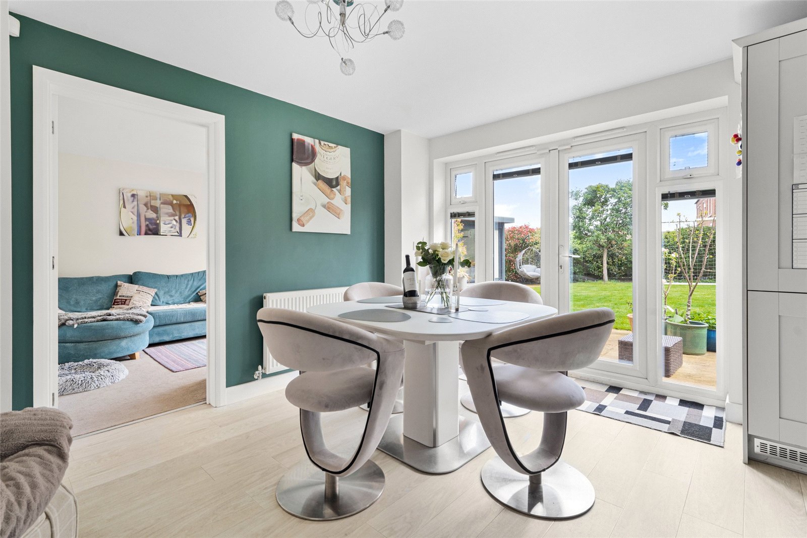 A fully upgraded kitchen with integrated appliances, a drinks cooler, and a quartz breakfast bar, with the dining area having direct access to the rear garden.