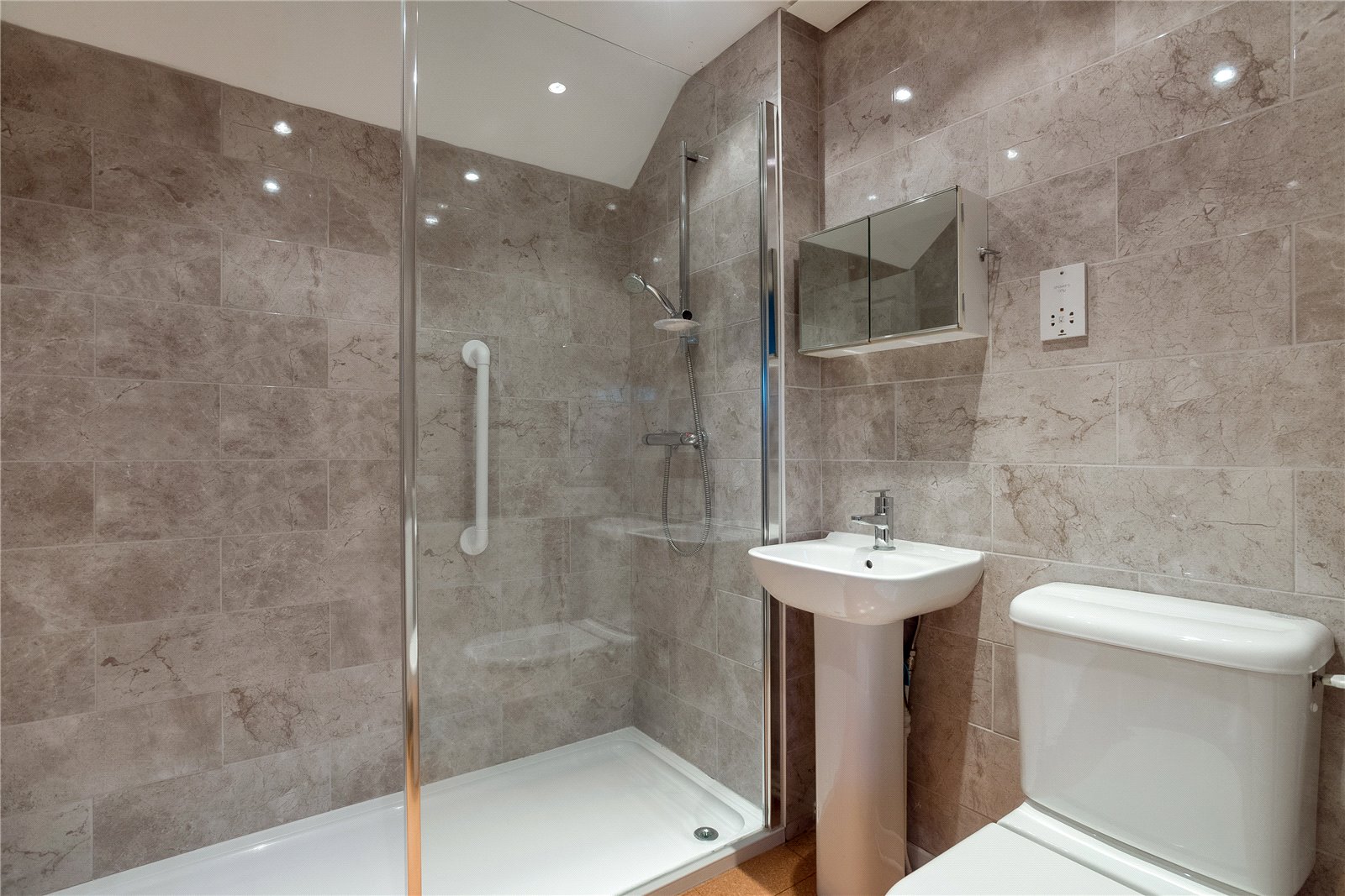 En-Suite Shower Room – Comprising White Suite of Walk in Double Shower Cubicle, Pedestal Hand Wash Basin and Low Level WC. Fully Tiled Walls and Heated Towel Rail